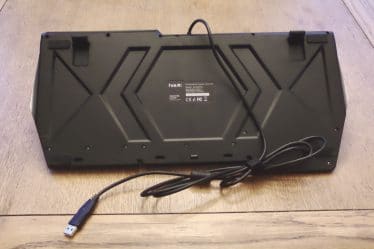 Der erste Eindruck der HV-KB378L ist durchaus positiv: Die Blende ist aus gebürstetem Aluminium, die integrierten Handballenauflagen aus Kunststoff liegen gut und sind mit einem wabenförmigen Muster versehen, die eine Griffigkeit bieten und das Abrutschen verhindern. Auf der Rückseite ist das USB-Kabel fest integriert. Die Ummantelung des Kabels ist deutlich dicker als üblich und wirkt äußerst stabil. Mit dem beigelegten Klettverschluss lässt sich das Kabel auf eine beliebige Länge zusammenlegen und befestigen. Massive und gummibeschichtete Füße sorgen einen außerordentlichen guten Halt auch auf glatten Oberflächen. Beim Verschieben nach hinten klappen die Füße aber zu leicht wieder ein, die Tastatur muss zum erneuten Platzieren angehoben werden.