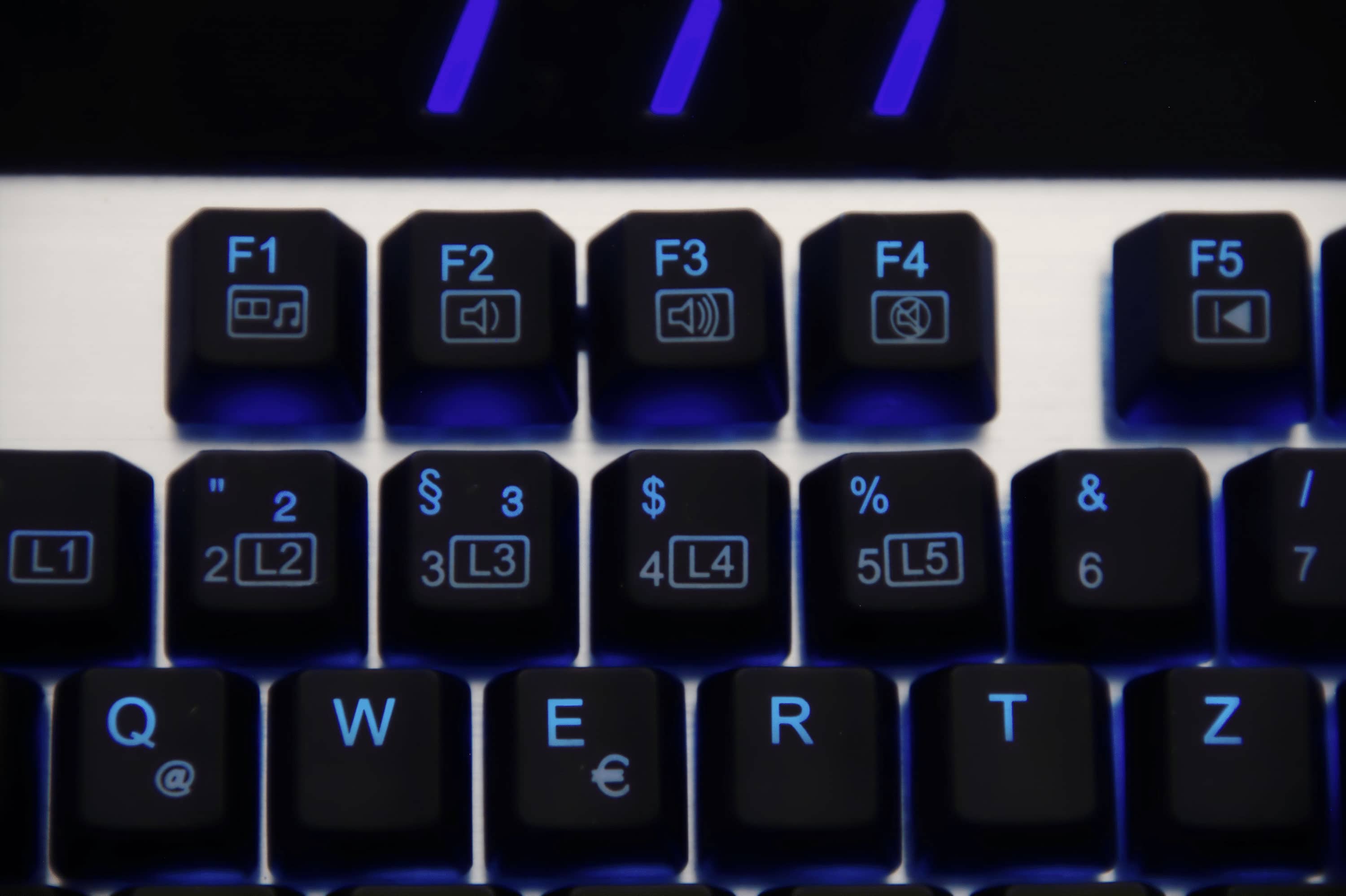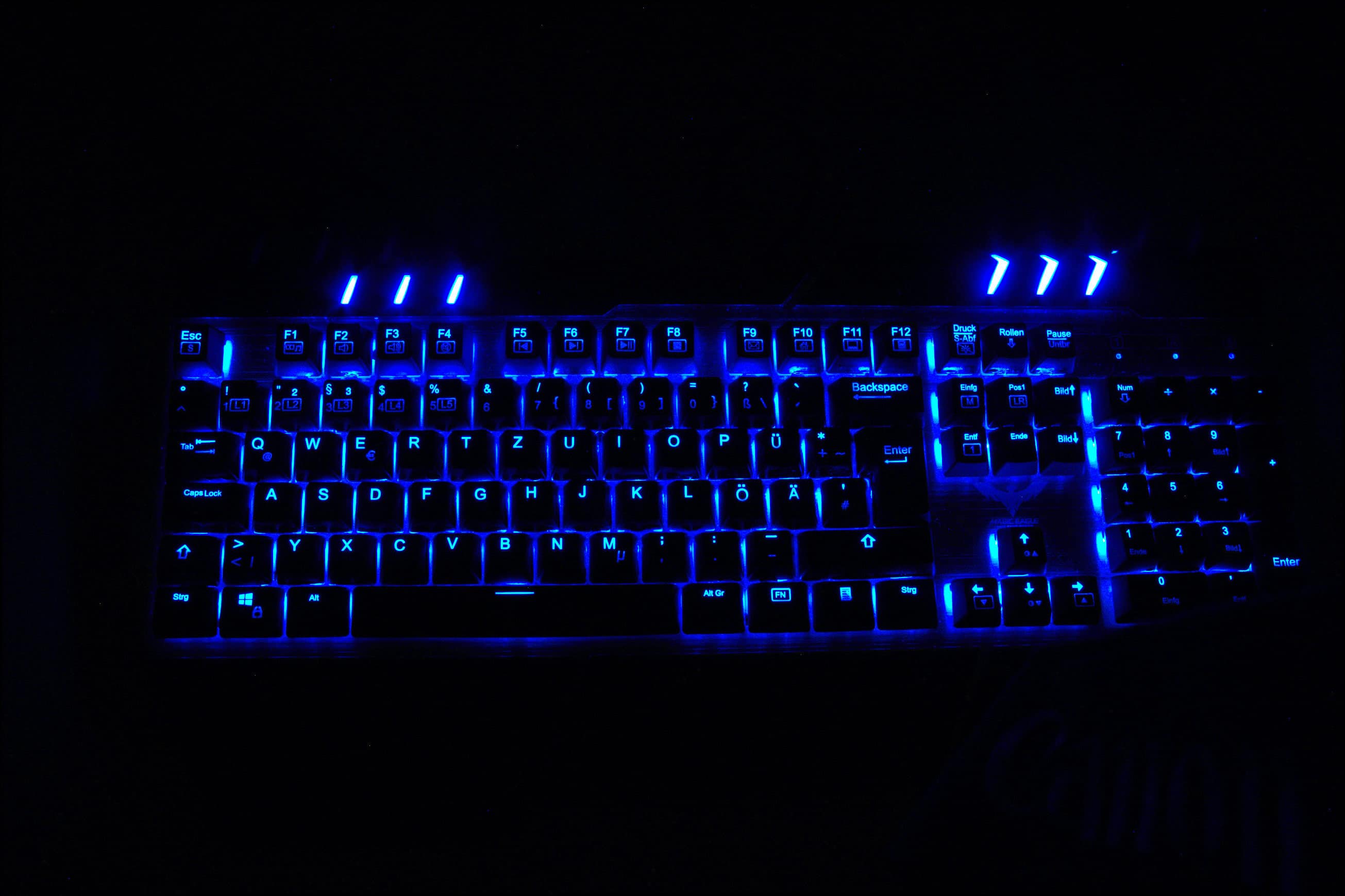 In dem beiliegenden Handbuch wird detailliert beschrieben, wie die LED-Beleuchtung per Tastenkombination eingestellt werden kann. So lässt sich sich beispielsweise der Atem-Effekt aktivieren, die Helligkeit in fünf Stufen einstellen, zwischen den sieben Grundfarben wechseln oder der Spielmodus aktivieren, bei dem nur Tastenkombinationen wie WASD beleuchtet sind. In insgesamt fünf Profilen lassen sich individuelle Einstellungen speichern, die bis zur individuellen Farbe für jede einzelne Taste hinreichen. Die blauen LEDs oben an der Tastatur lassen sich jedoch nicht deaktivieren und können auch nicht in die Effekte integriert werden.