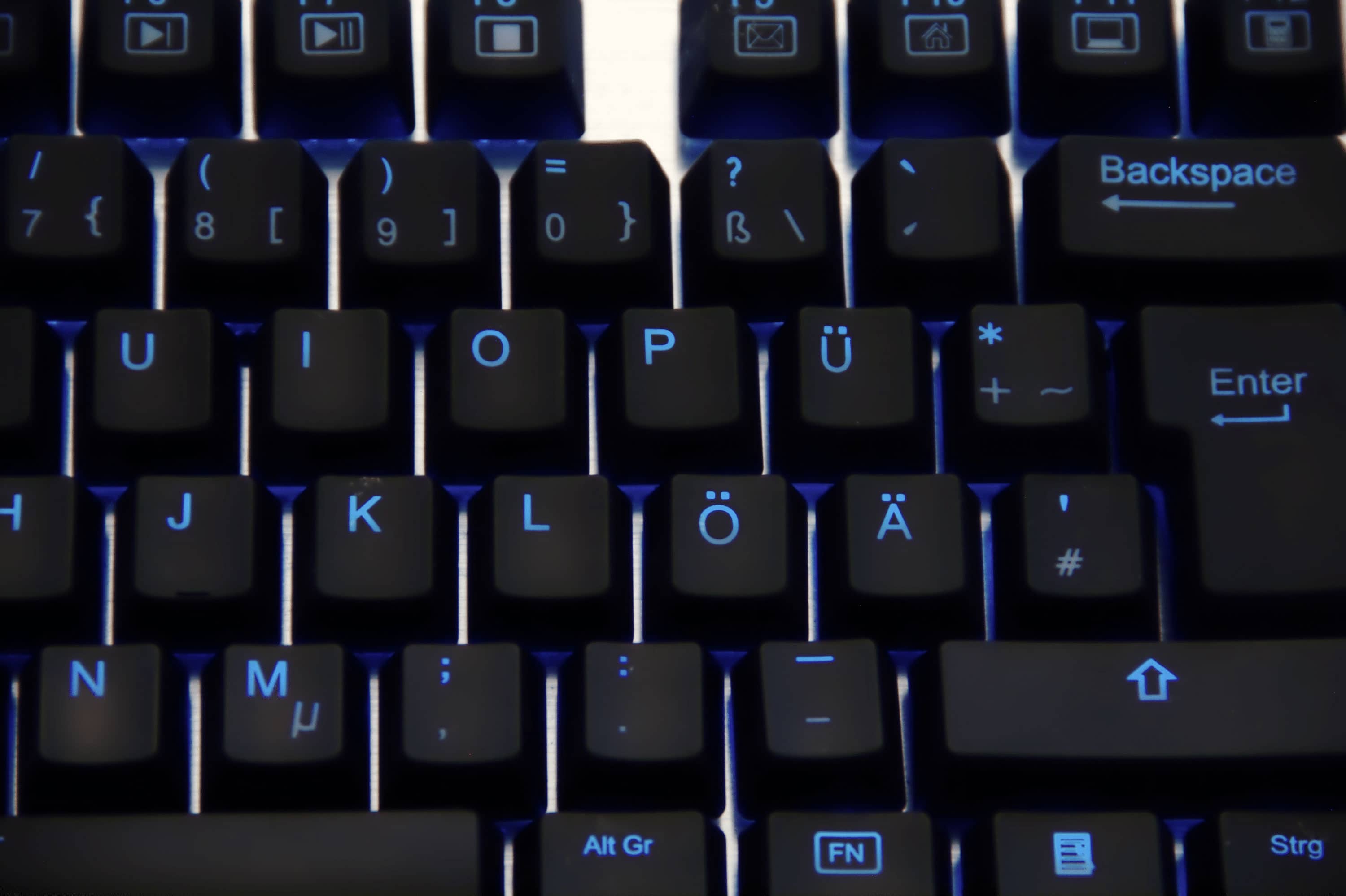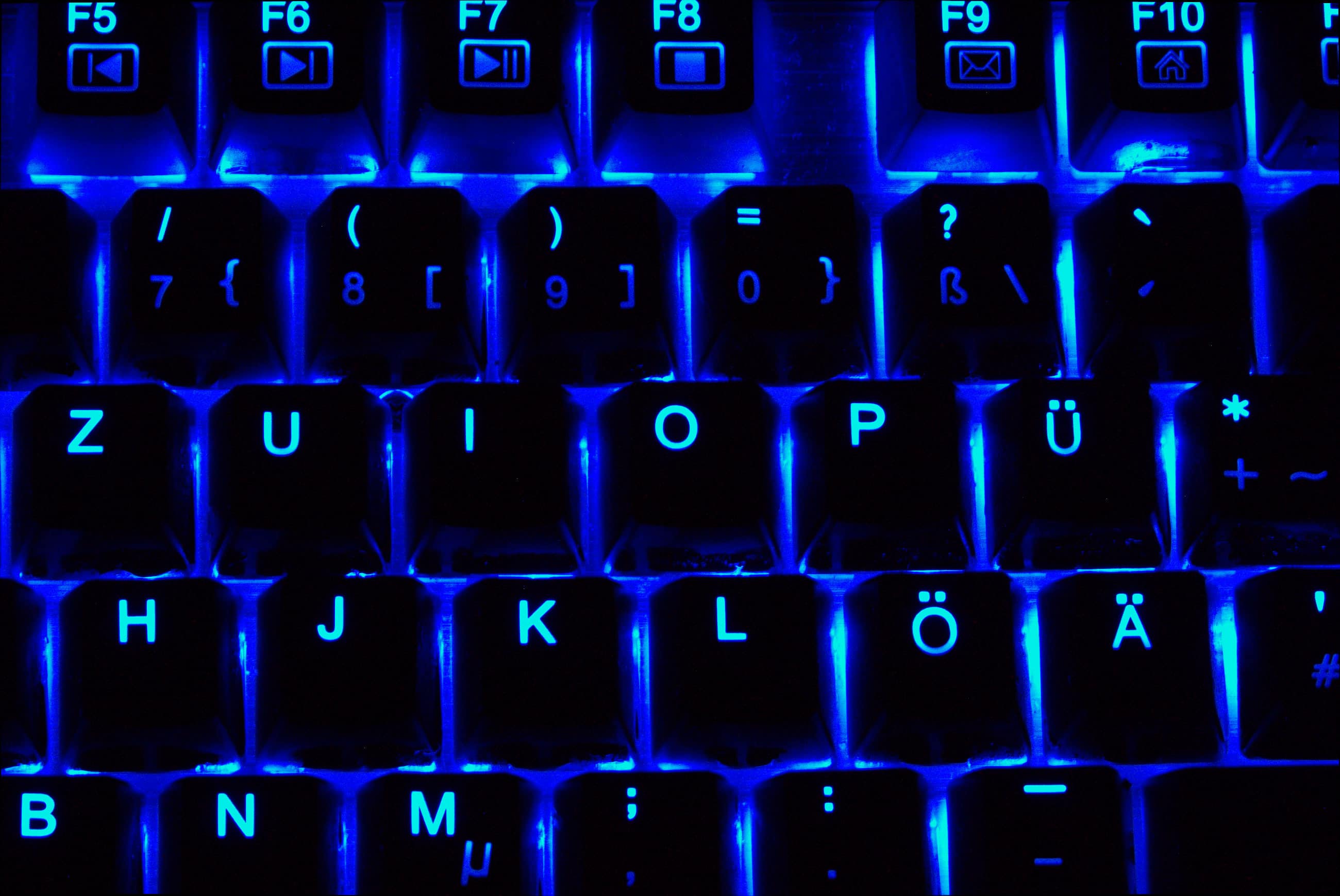 Was sofort auffällt ist, dass nicht alle Tasten durchgehend beleuchtet sind. Die LEDs liegen im oberen Bereich der jeweiligen Tasten. Selbst mit der am stärksten leuchtenden weißen Farbe in der höchsten Helligkeitsstufe beleuchten die Buchstaben nicht komplett. Das fällt besonders bei den Zahlentasten der oberen Reihe und den Satzzeichen in der unteren Reihe auf. Während die Sonderzeichen beleuchtet sind, bleiben die Zahlen fast komplett dunkel und auch die Beleuchtung des Punkts, des Kommas und des Minuszeichens lassen sich nur erahnen. Auch die Symbole der Multimedia-Funktionen sind nur schwach beleuchtet. Bei der weißen und gelben Beleuchtung fällt zudem ein rosa Stich auf, der in den oberen Tastenreihen stärker wird. Alle anderen fünf Farben sind davon nicht betroffen.