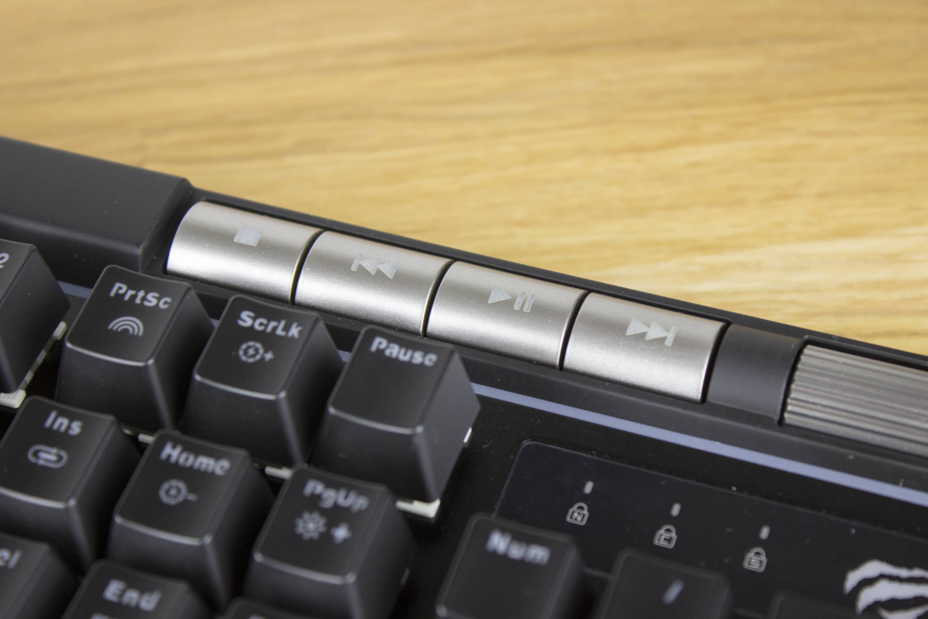Durch die vielen Funktionstasten auf der linken Seite ist die Tastatur sehr klobig. Hinzukommen noch weitere Zusatztasten am oberen Rand und die Tasten zur Mediensteuerung. Die Mediensteuerung und die Funktionstasten im oberen Bereich sind etwas angehoben. Getrennt werden sie vom Rest durch eine Leiste mit RGB-Beleuchtung.