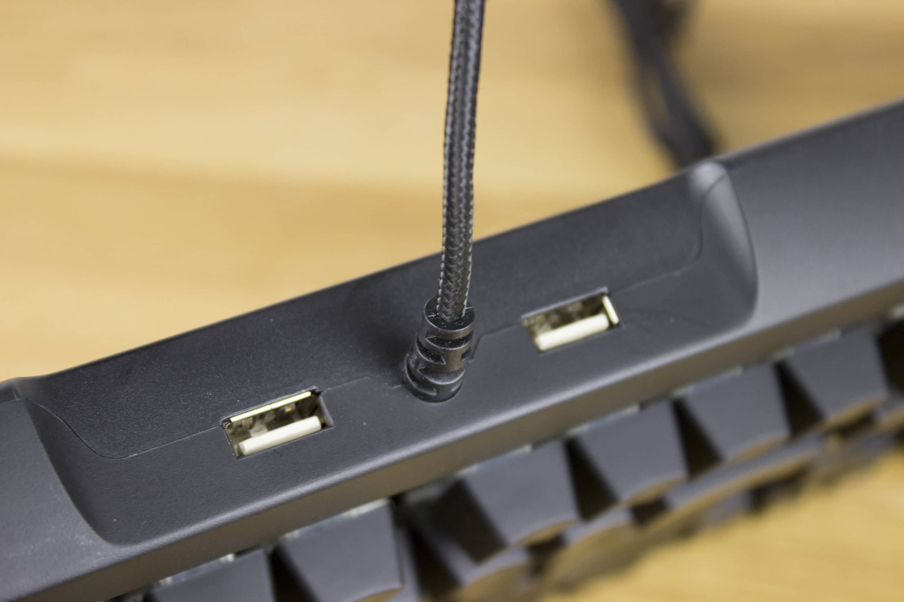 Mit einer Abmessung von 487 x 228 x 37 Millimetern ist die KB462L ein richtiger Klotz, der durch die Handballenablage sogar noch großer wird. Ausreichend Platz vor dem Monitor solltet ihr also mitbringen, wenn ihr euch für diese Tastatur entscheidet. Mit 1,5 Metern ist das stoffummantelte Kabel lang genug für Standard-Schreibtischkonfigurationen. Auf der Rückseite der Tastatur finden wir außerdem noch zwei USB-2.0-Anschlüsse. USB-Sticks wurden reibungslos erkannt, genau wie der Empfänger für die Logitech G Pro Wireless. Über Schreibraten brauchen wir uns hier sicher nicht unterhalten, aber wir können sagen: Die Anschlüsse funktionieren.