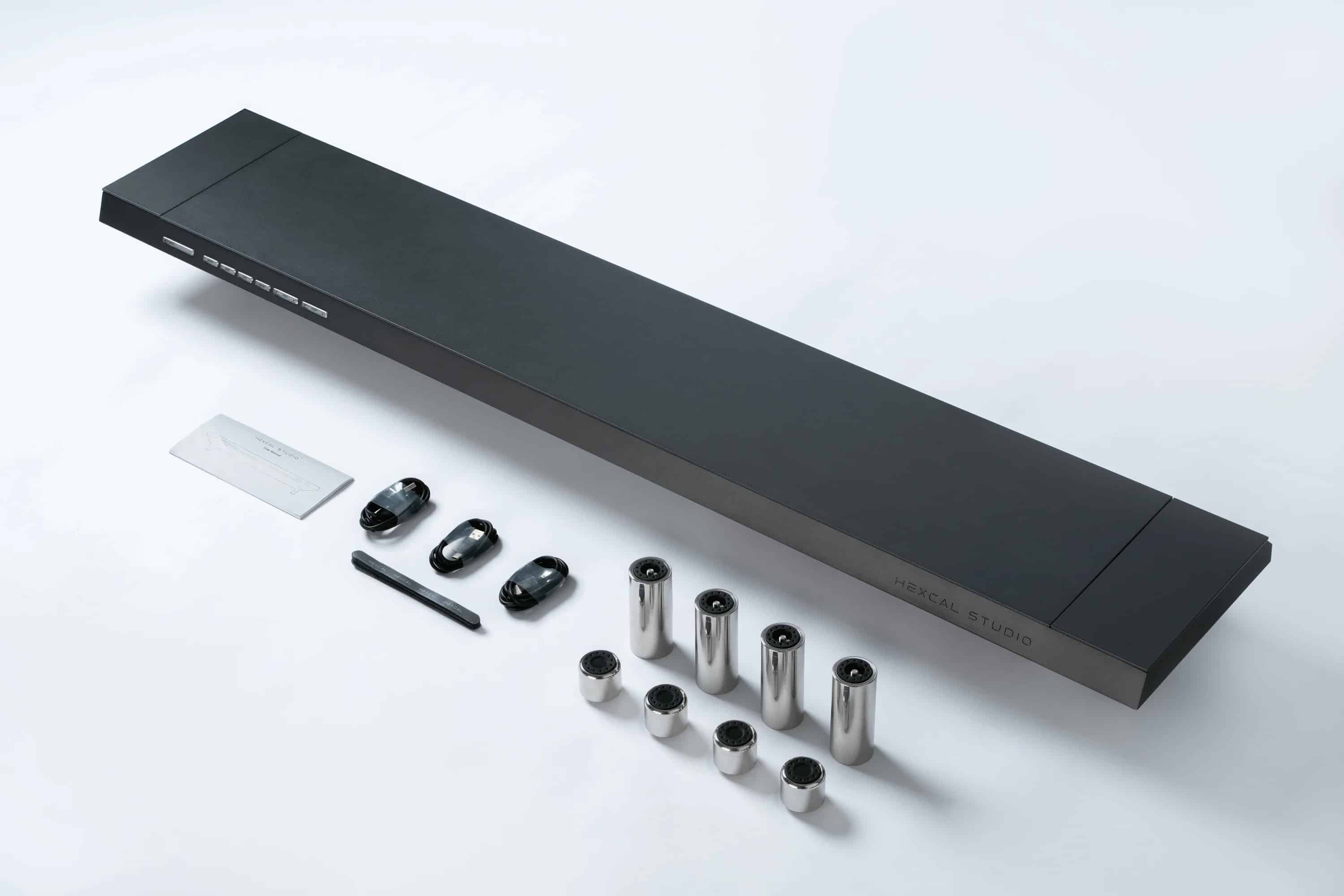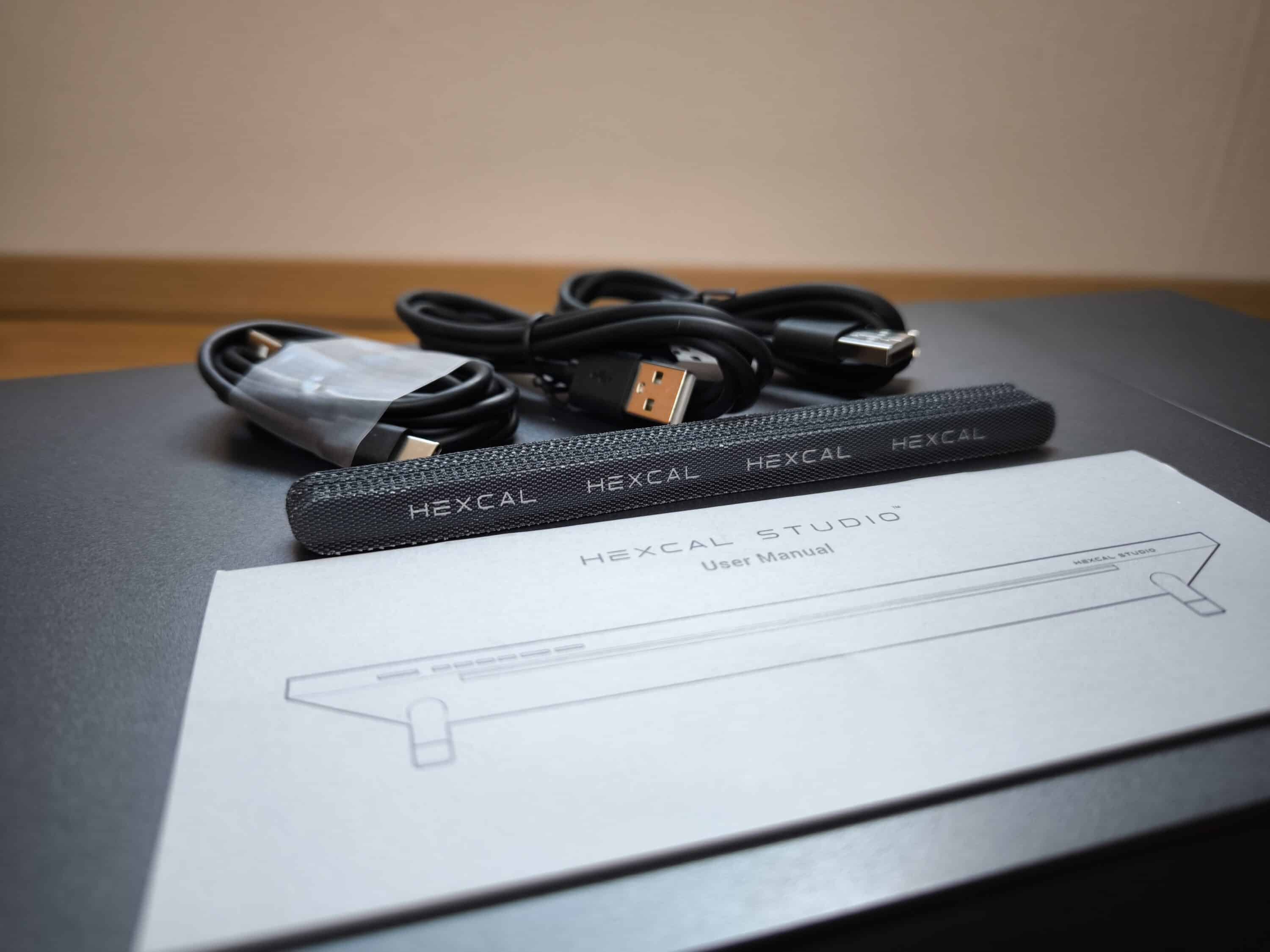 Um das Hexcal Studio aufzustellen, benötigt man vier Edelstahlfüße. Ein Verlängerungsset zum Anheben des Produkts ist im Inneren des Studios verstaut. Das weitere Zubehör ist in einer separaten Verpackung untergebracht. Dazu gehören acht Klett-Kabelbinder, die vier erwähnten Edelstahlfüße und auch die Bedienungsanleitung. Ein USB-A auf USB-C Kabel für zukünftige Firmware-Upgrades und zwei USB-A auf USB-A Kabel für die Datenübertragung sind ebenfalls im Lieferumfang enthalten.