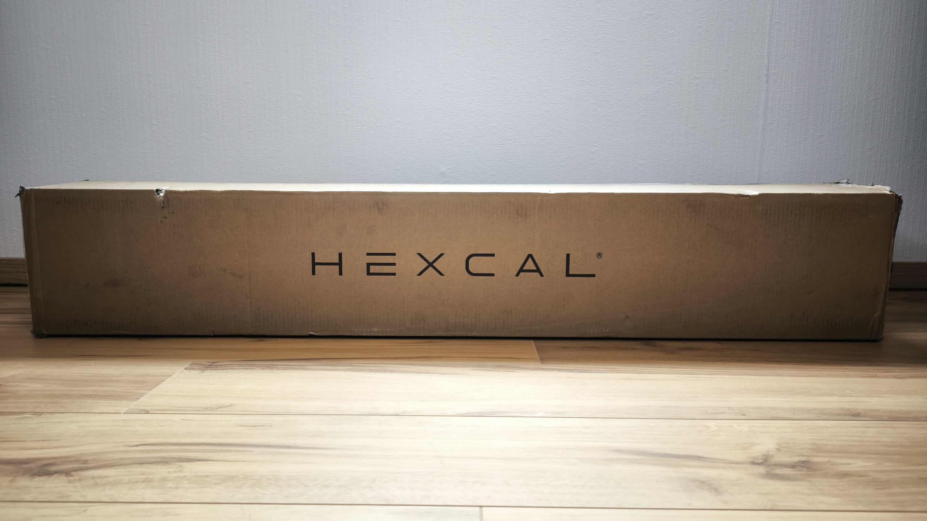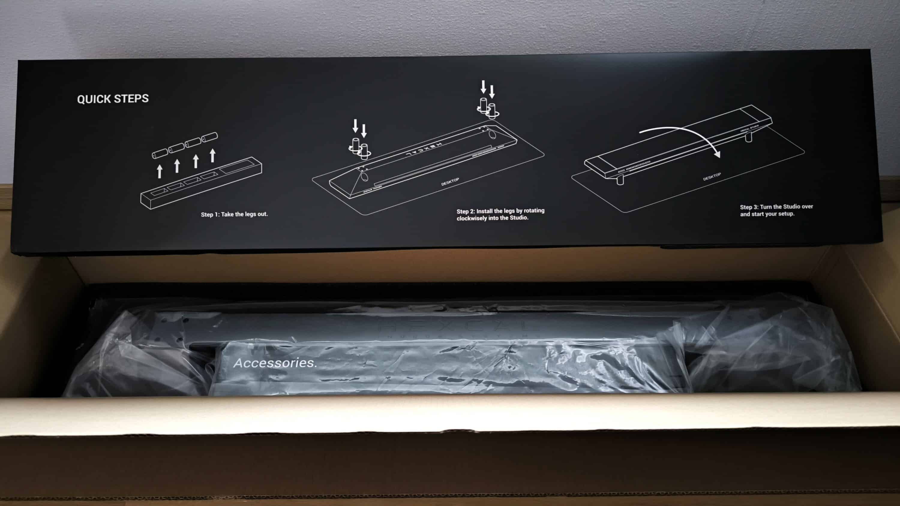 Das Hexcal Studio wird in einer braunen, länglichen Kartonverpackung geliefert. Beim Auspacken fällt auf, dass die Schnellstartanleitung über die gesamte Länge auf schwarzem Schaumstoff gedruckt ist und gleichzeitig als Polsterung für das Hexcal Studio dient.