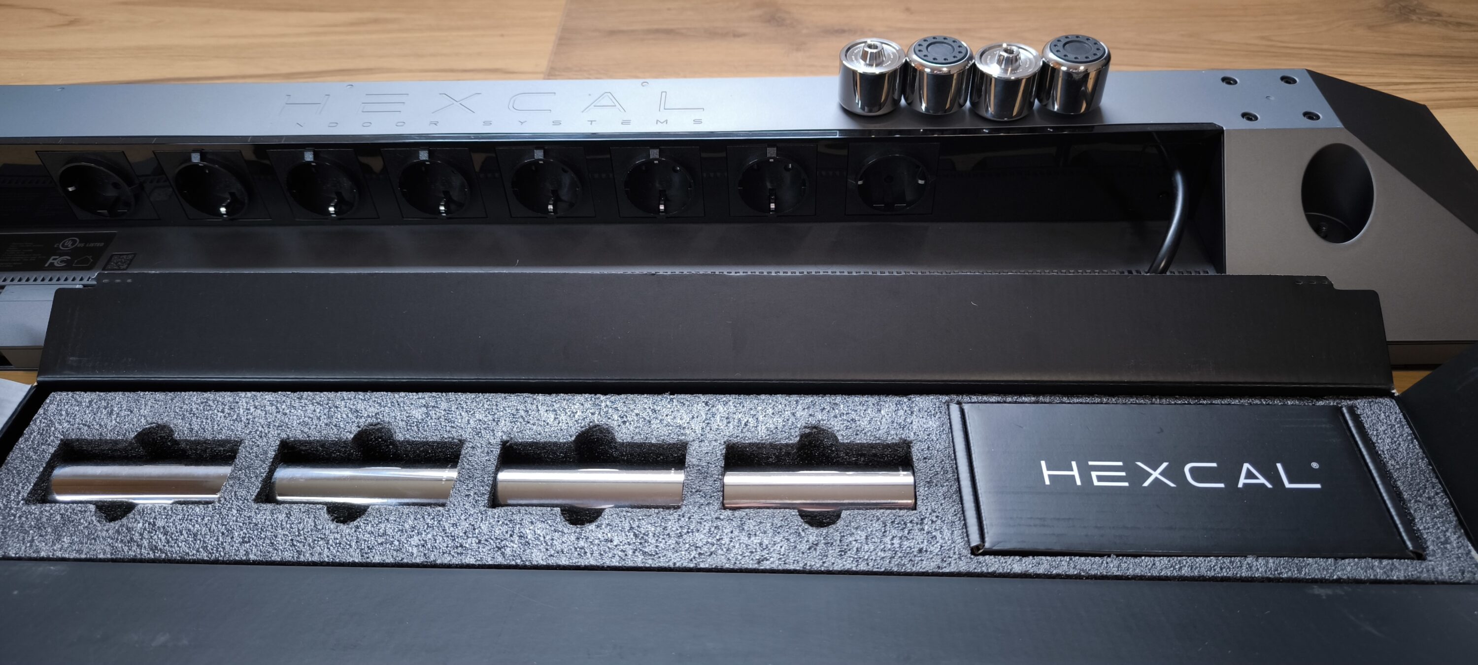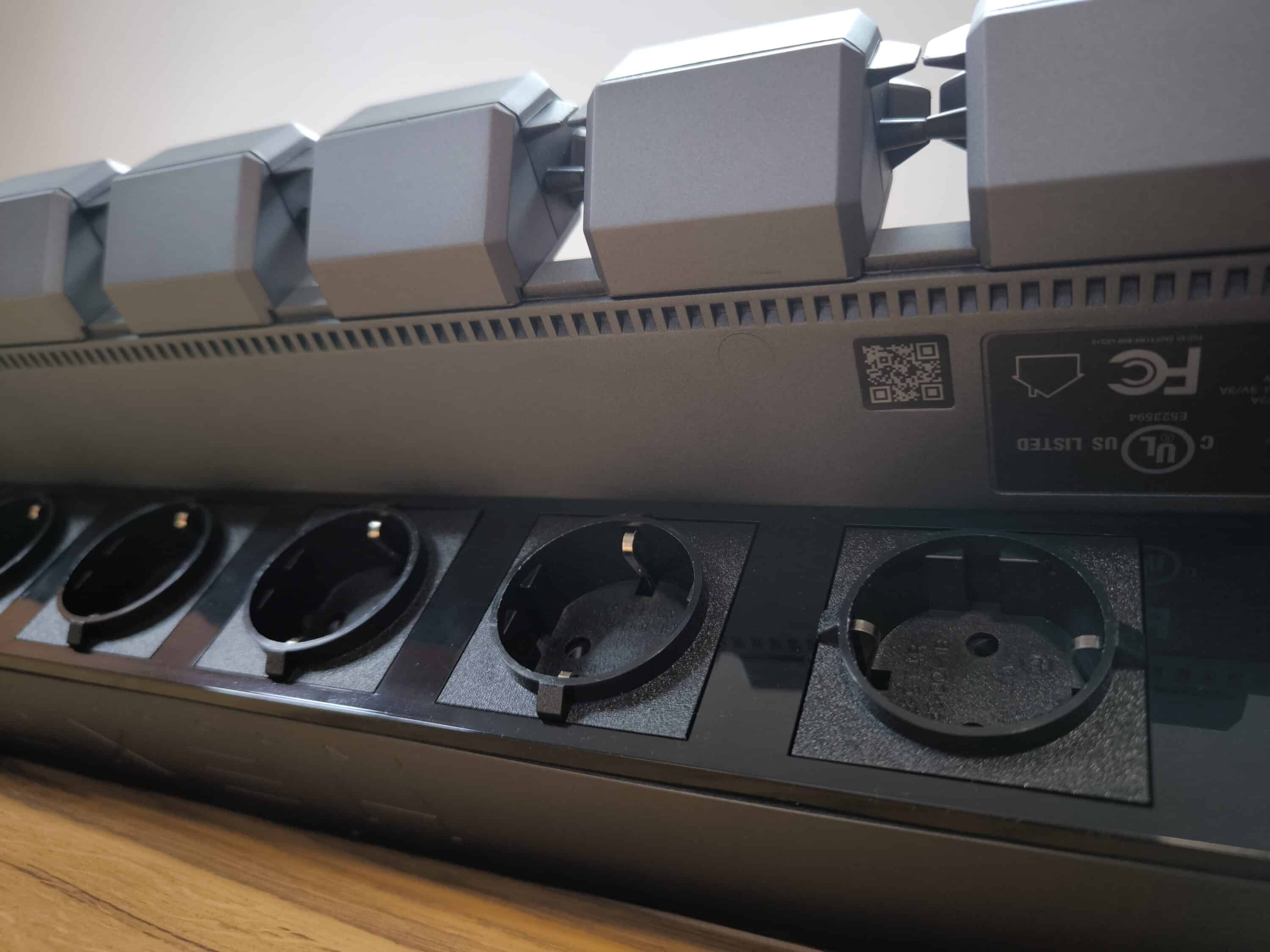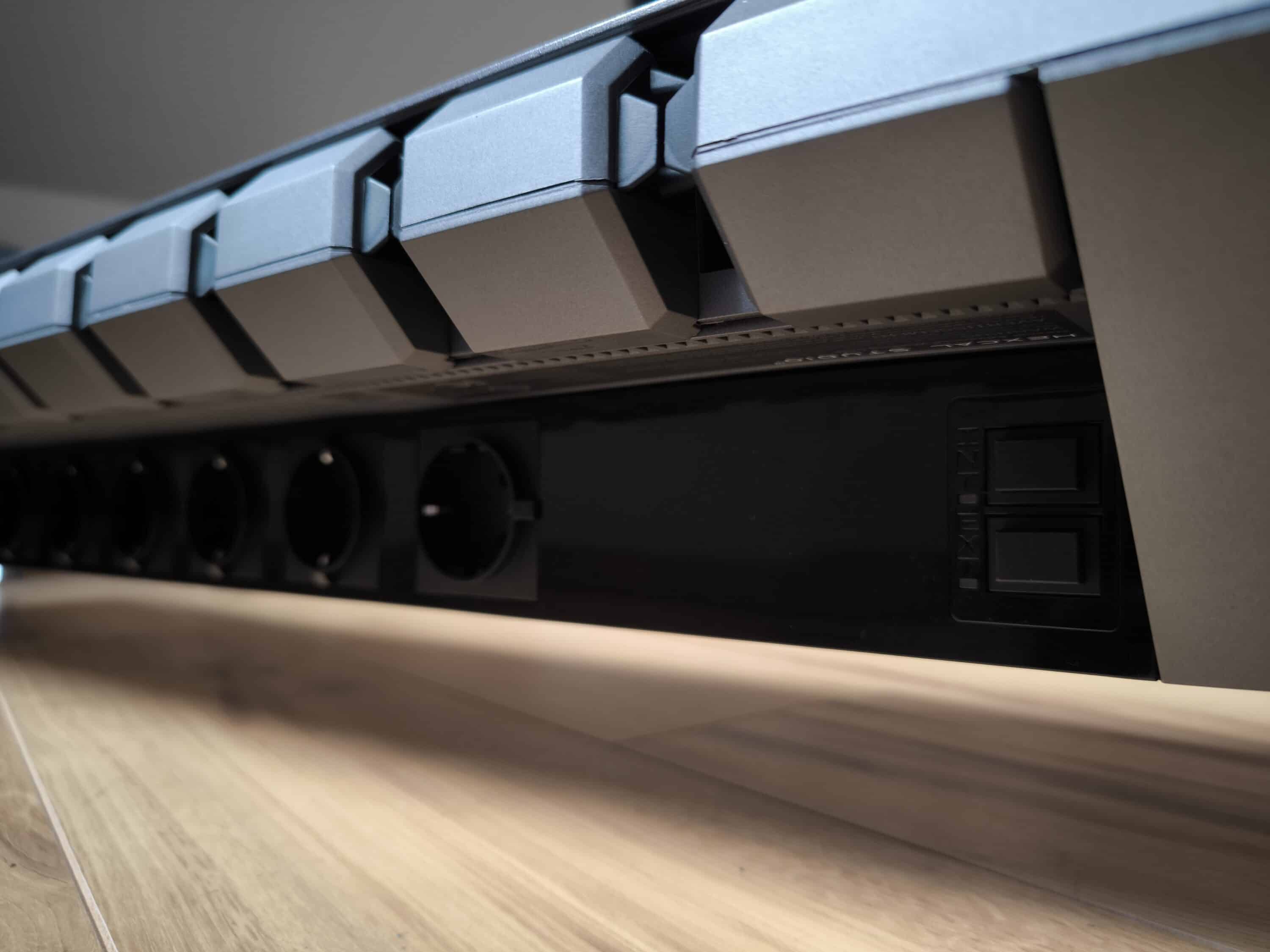 Es ist fast eine Provokation zu sagen, dass das Hexcal Studio auf der Rückseite nur eine Steckdosenleiste hat. Tatsächlich bietet das Studio eine ganze Ecke mehr und kann so neben den acht AC-Steckdosen inklusive Leitungsschutzschalter bis zu 14 Geräte mit Strom versorgen. Selbst bei den Steckdosen hat man sich ausgiebig Gedanken gemacht. Sie sind sowohl vertikal als auch horizontal angeordnet, sodass selbst schmale und sperrige Netzstecker sinnvoll integriert werden können.