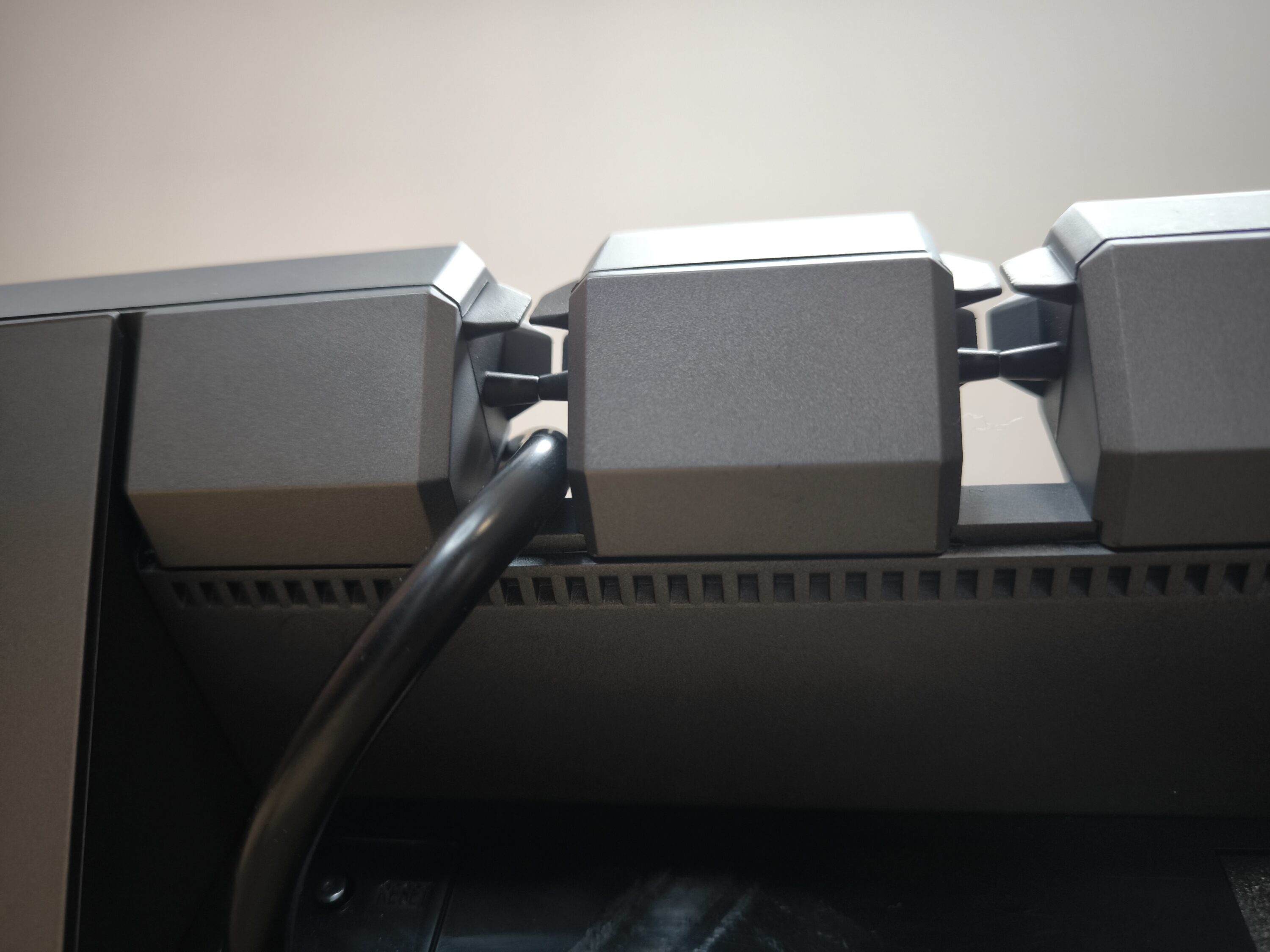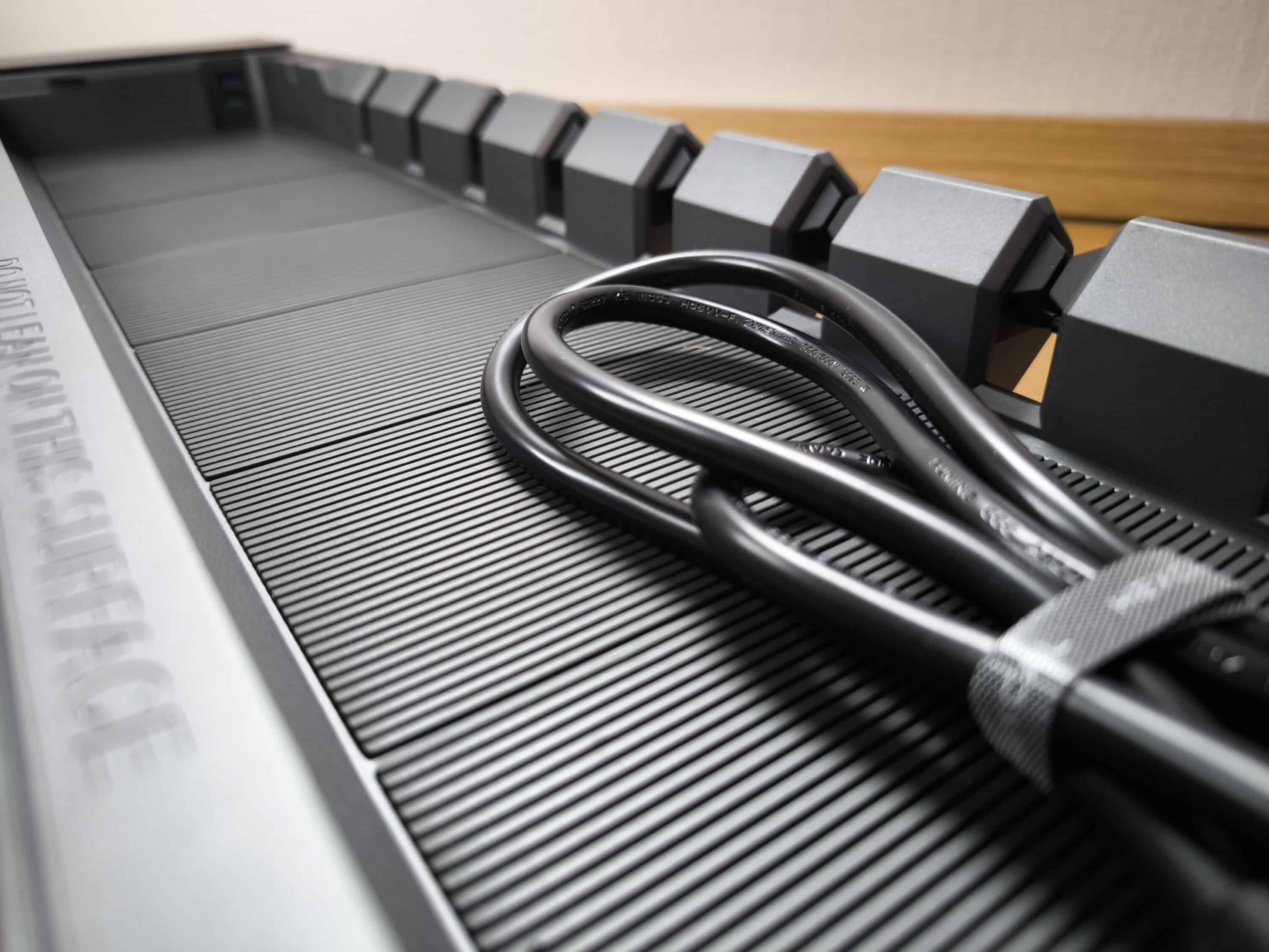 Das Hexcal Studio verfügt über ein ausgeklügeltes Kabelmanagementsystem auf der Rückseite, das die Leitungen ordentlich und zugänglich hält. Hexcal bezeichnet das selbst entwickelte System als „3D Cord Organization System“. Spezielle Führungen sorgen dafür, dass die Kabelsätze nicht durcheinander geraten oder beschädigt werden. Über 12 separate Eingänge lassen sich somit selbst größere Kabel sinnvoll einführen. Zudem helfen die flexiblen, allerdings auch etwas steifen Halterungen, die ein Herausrutschen der eingelegten Leitungen verhindern. Dabei ist es sogar völlig unerheblich, woher das Kabel ursprünglich stammt. Eventuelle Geräte, die nicht innerhalb des Hexcal Studios untergebracht sind, können auch durch diese Fixierungen verlegt werden.