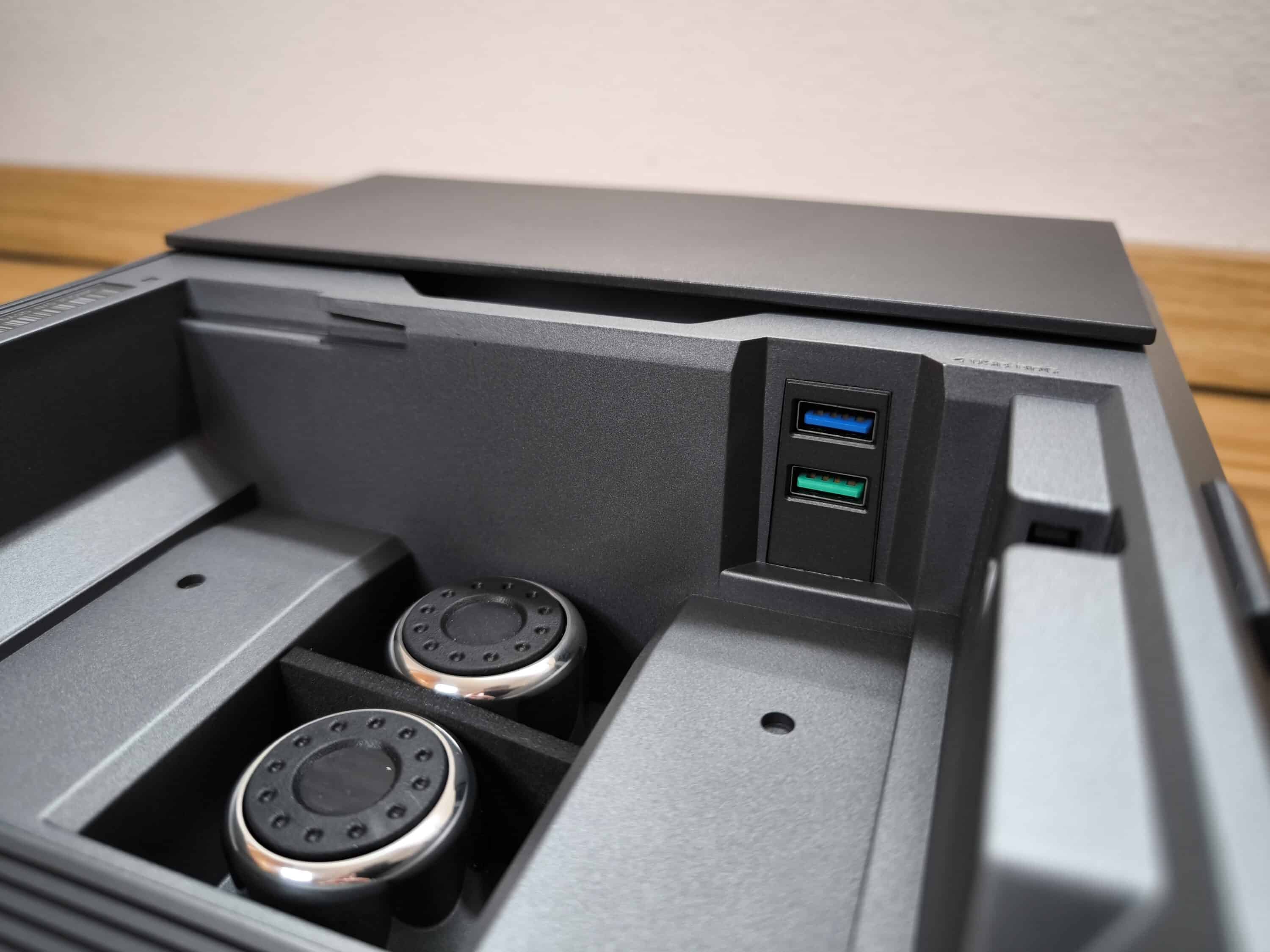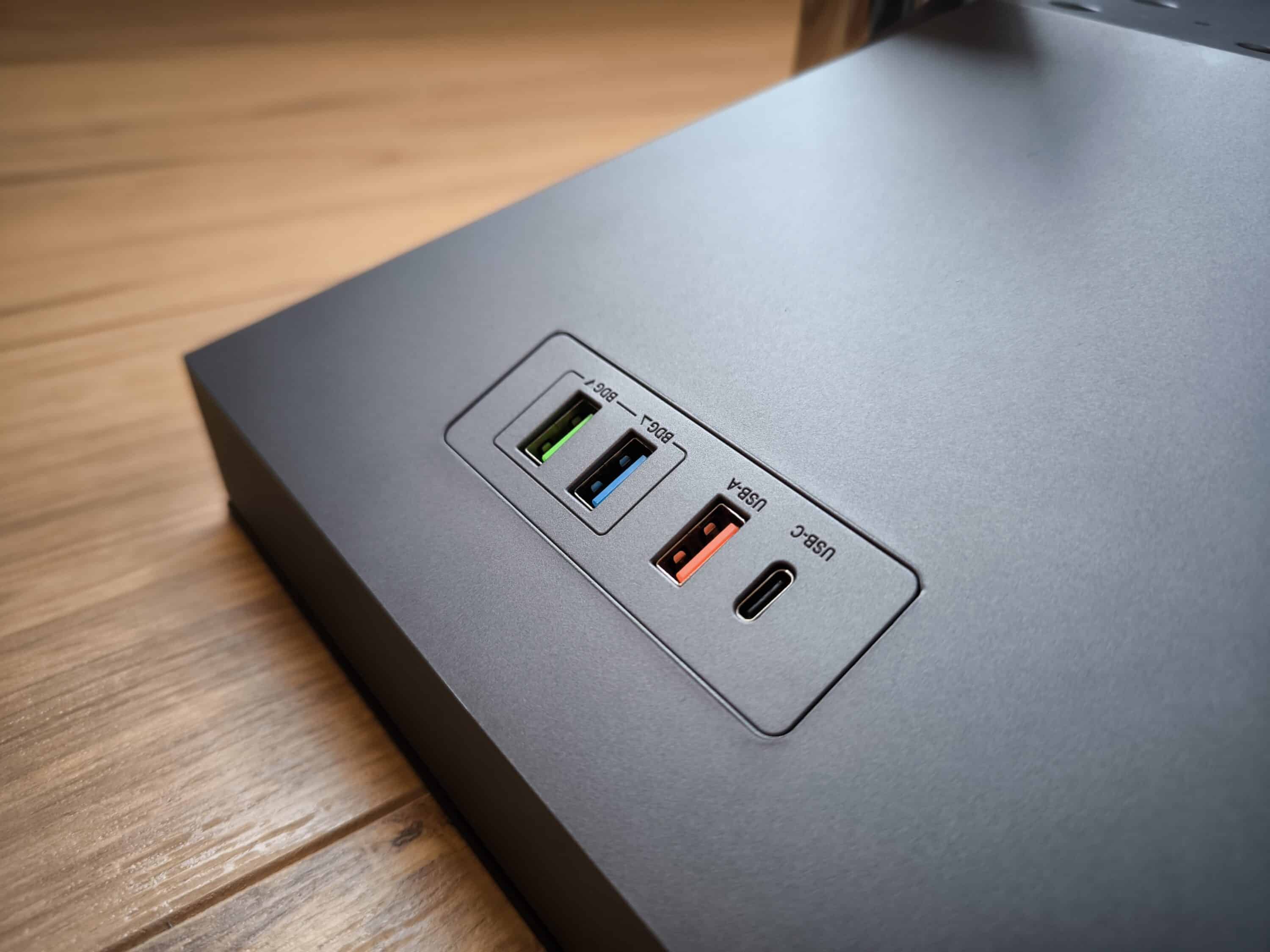 Neben den AC-Steckdosen verfügt das Hexcal Studio auch über zwei USB-Anschlüsse, je 1x USB-C sowie USB-A zur Stromversorgung. Für den Datentransfer stehen direkt daneben zwei weitere USB-Anschlüsse zur Verfügung. Dies ist vor allem für den schnellen Zugriff auf eventuelle Geräte im Inneren des Gehäuses von Vorteil. Zu beachten gilt jedoch, dass diese USB-Ports in der Regel keine Datenübertragung für Apple-Geräte unterstützen.