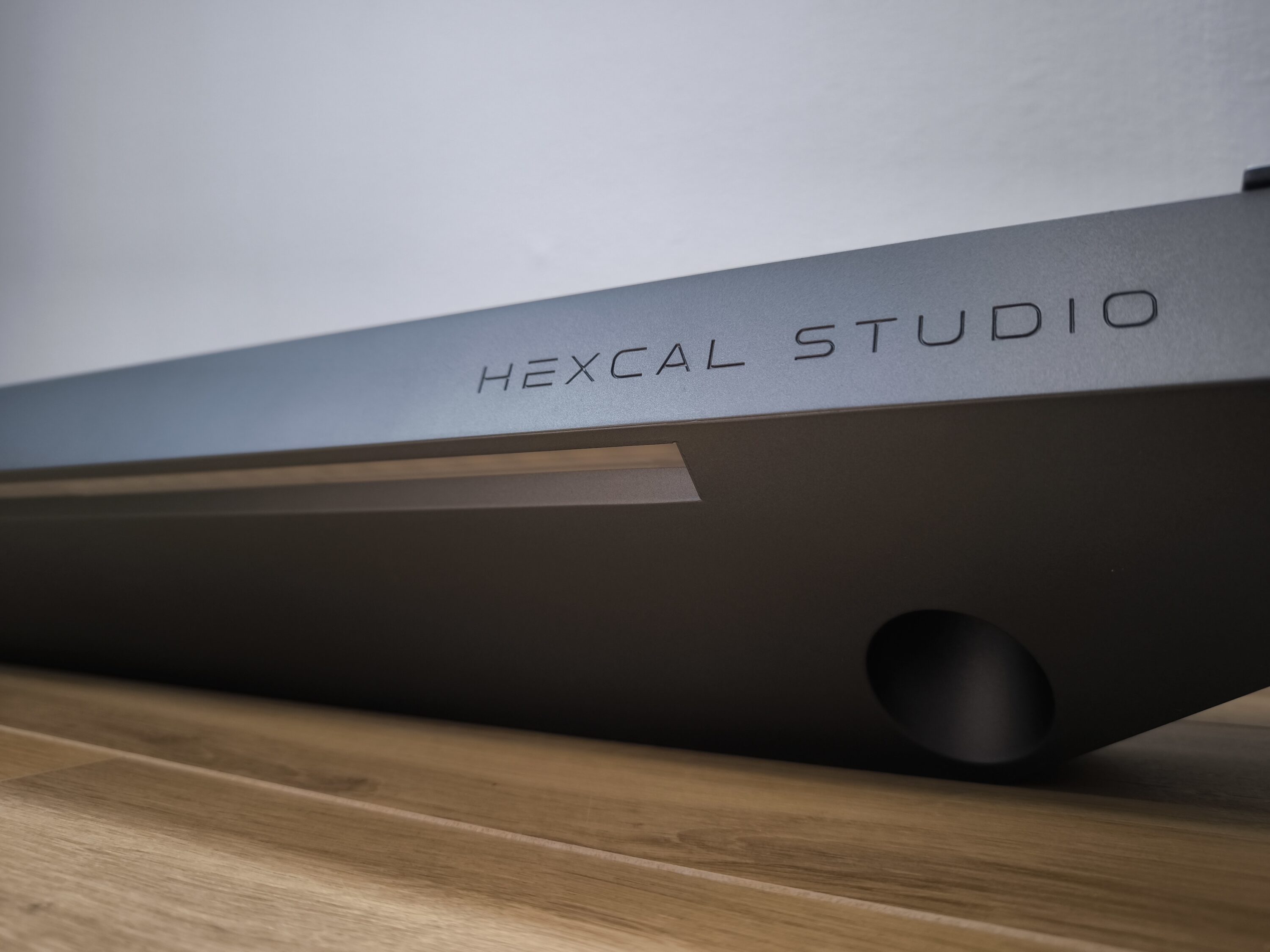 Rein optisch ist das Hexcal Studio mit der abnehmbaren Aluminiumoberfläche ein echter Hingucker. Die obere Ablagefläche von ca. 102 x 20 cm bietet ausreichend Platz für einen großen Widescreen- oder zwei handelsübliche Monitore. Darunter befindet sich der 4 cm hohe Stauraum, in dem vor allem die Verkabelung untergebracht wird. Der edle Grau-Look zieht sich durch das gesamte Hexcal Studio und macht auch im Innenraum nicht Halt. In Kombination mit der Hexcal Desk Mat, die sich platzsparend unter das Hexcal Studio schmiegt, sieht der moderne, zeitlose Look noch überzeugender aus. Auch die weiße LED-Leiste sowie die Bedienelemente an der Vorderseite des Studios bilden in Verbindung mit den schweren Edelstahlfüßen einen markanten Blickfang. Außerdem ziert ein prägnanter „HEXCAL STUDIO“-Aufdruck die rechte Vorderseite. Was die weitere Zusammensetzung der Materialien betrifft, so besteht das Hexcal Studio im Wesentlichen aus matt-grauem Kunststoff.