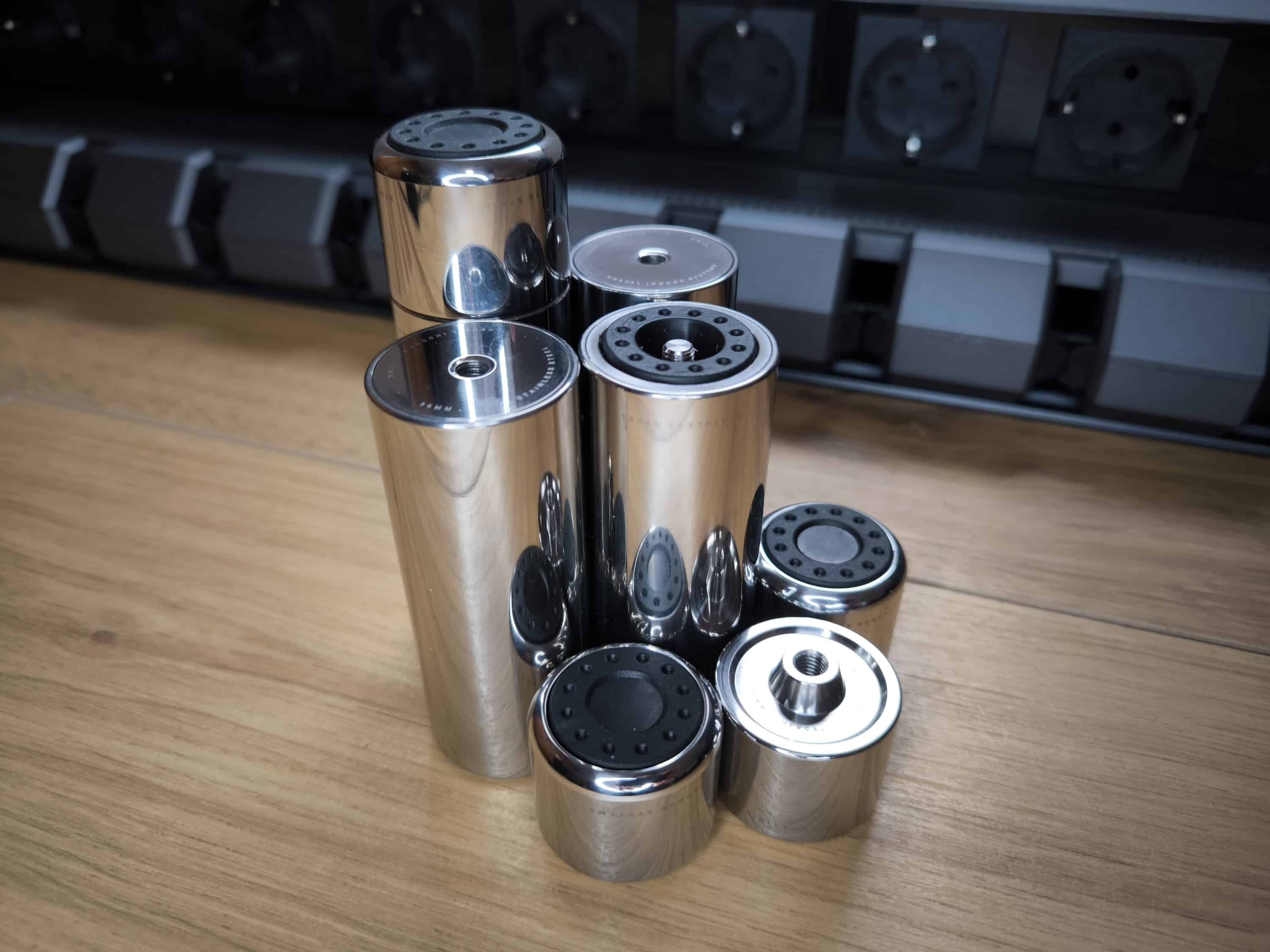 Nachdem das Hexcal Studio wieder geschlossen wurde, wird es einmal umgedreht, damit sich die zusammengesteckten Edelstahlfüße montieren lassen. Auf jeder Seite des Hexcal Studios sind somit zwei Füße vorhanden, die für einen sicheren Stand sorgen.