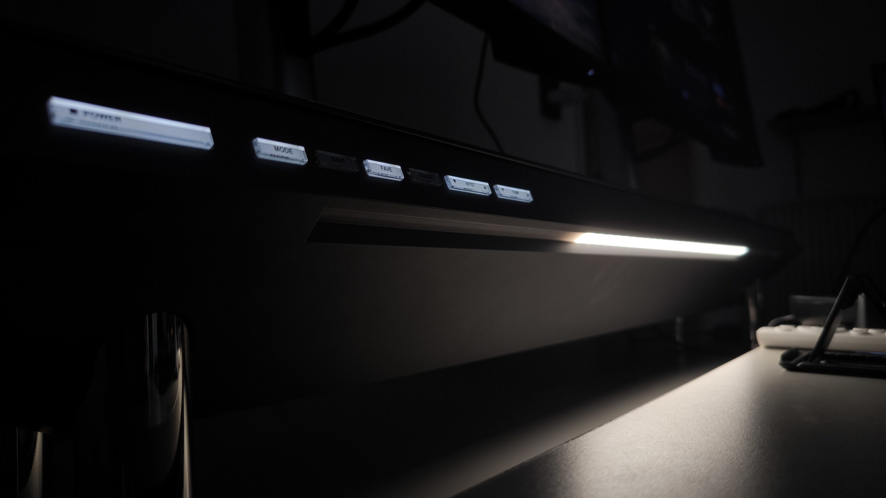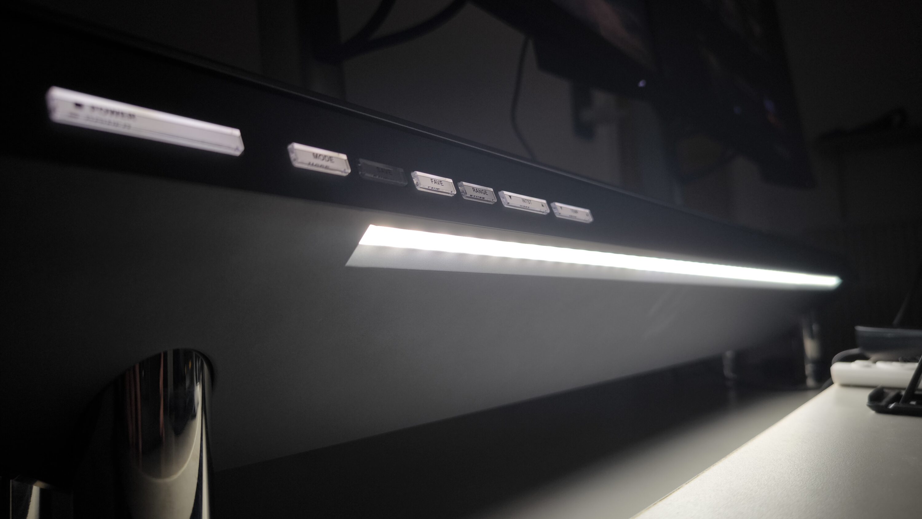 Über die Bedienelemente auf der linken Seite des Hexcal Studios kann die Beleuchtung aktiviert und an die eigenen Bedürfnisse angepasst werden. Neben der Lichttemperatur lässt sich auch die Intensität einstellen. Ob die Beleuchtung über die gesamte Breite oder z.B. nur die beiden mittleren LED-Streifen leuchten sollen, kann über den Range-Button konfiguriert werden. Dabei ist nicht nur ein festes Ein- und Ausschalten der Streifen möglich, sondern es kann jeweils in 25%-Schritten gedimmt werden.