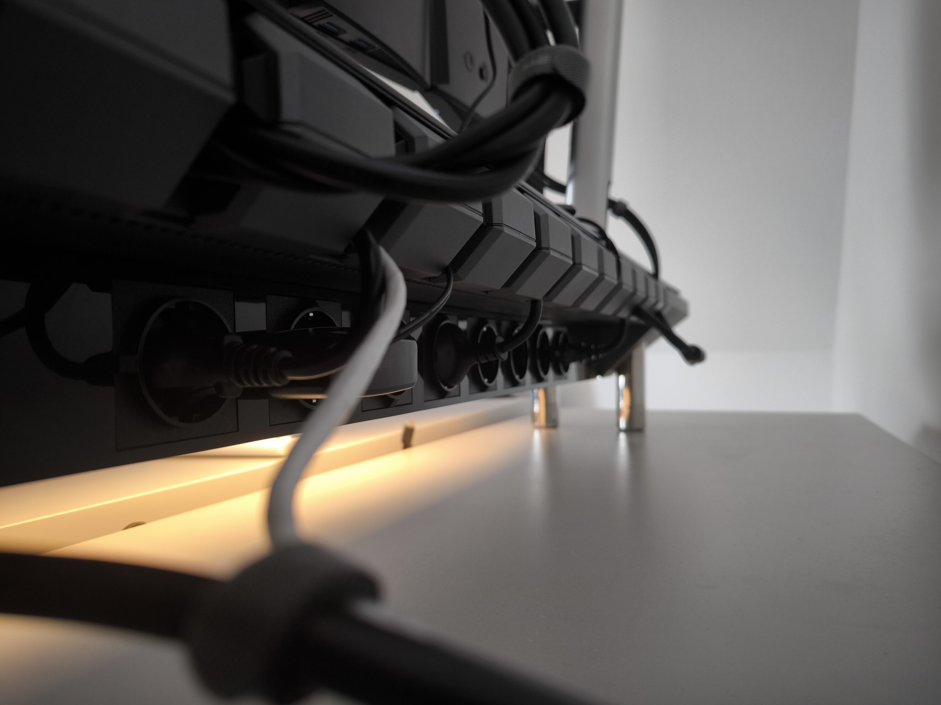 Im Test haben wir von den insgesamt acht Steckdosen auf der Rückseite trotz eines voll bestückten Arbeitsplatzes letztlich vier Steckdosen effektiv frei. In Summe versorgt das Hexcal Studio somit zwei Monitore, ein Headset und eine innen angebrachte 180 Watt USB-C Dockingstation mit Strom. Im gesamten Testzeitraum hatten wir mit diesem Setup keinerlei Probleme zwecks der Stromversorgung. Erwähnenswert ist in diesem Zusammenhang, dass das Hexcal Studio bis zu 1.440 Watt (120 V/12 A) unterstützt. Sollte dies einmal überschritten werden, greift der eingebaute Überstromschutz.