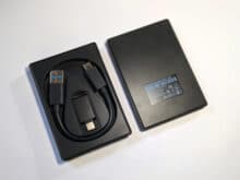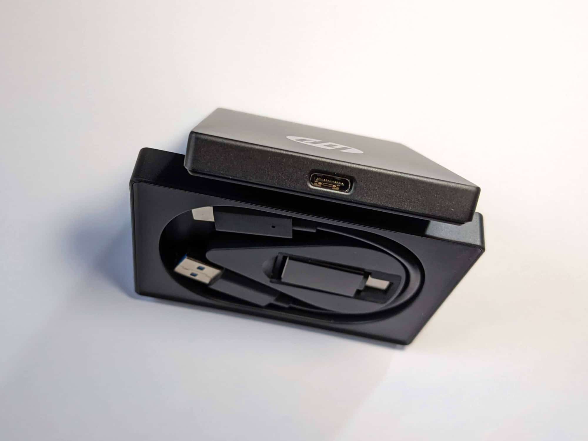 Beim oberen Teil des Gehäuses handelt es sich um die SSD selbst, der untere Teil bietet Stauraum für ein USB-Kabel. Dieses liegt als USB-C zu USB-A Kabel bereits bei. Weiterhin befindet sich ein Adapter von USB-A auf USB-C im Lieferumfang. Das USB-Kabel ist mit einer Länge von 15 cm sehr kurz, so dass es sich nur für den Einsatz am Front-USB oder am Notebook eignet. Dies ist wohl vor allem dem nur wenig vorhanden Platz in der Box geschuldet und stellt im Alltag auch nur selten ein Problem dar.