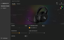 Eine LED gibt es dennoch am Headset. Diese zeigt den aktuellen Ladestand an. Zwischen 90 und 100 Prozent leuchtet die LED dauerhaft grün, darunter fängt sie an sie blinken und leuchtet unter 15 Prozent Akkustand dann dauerhaft rot. Über die HyperX NGENUITY Software kann auch jederzeit der Akkustand in Prozent ausgelesen werden.