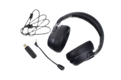 Nach dem Auspacken der weiß-roten Verpackung hat man das Headset, einen USB-Empfänger, ein abnehmbares Mikrofon und ein MicroUSB-Ladekabel vor sich liegen und fragt sich: fehlt da nicht etwas?