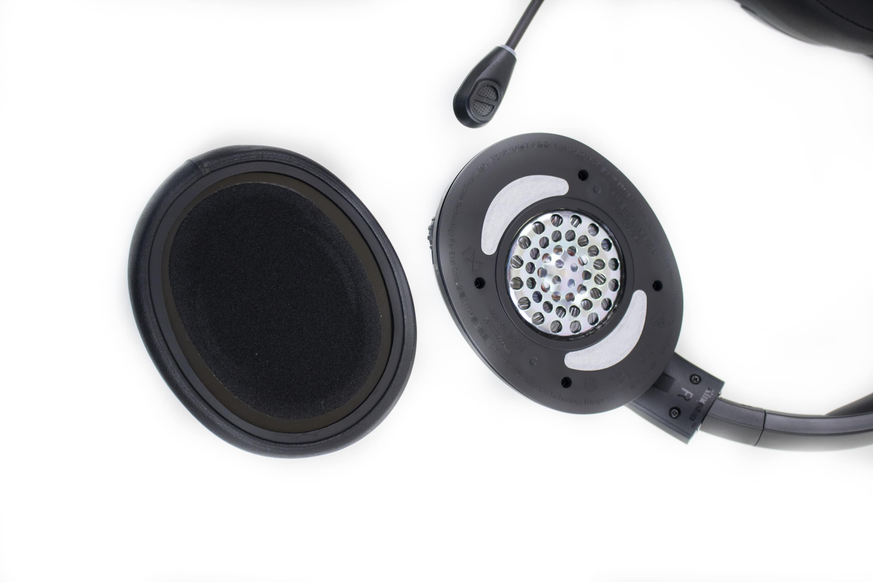 Die mit Kunstleder überzogene Polsterung am Kopfbügel ist sehr dünn und weich, aber absolut ausreichend. Dicker ist die Polsterung der Ohrmuscheln. Diese beträgt etwa 2,3 cm. Die Innenabmessungen der Ohrpolster betragen 6,5 x 4 x 2 cm, sodass auch große Ohren Platz haben dürften. Durch die weiche Polsterung der Ohrmuscheln ist das Headset auch für Brillenträger geeignet.
