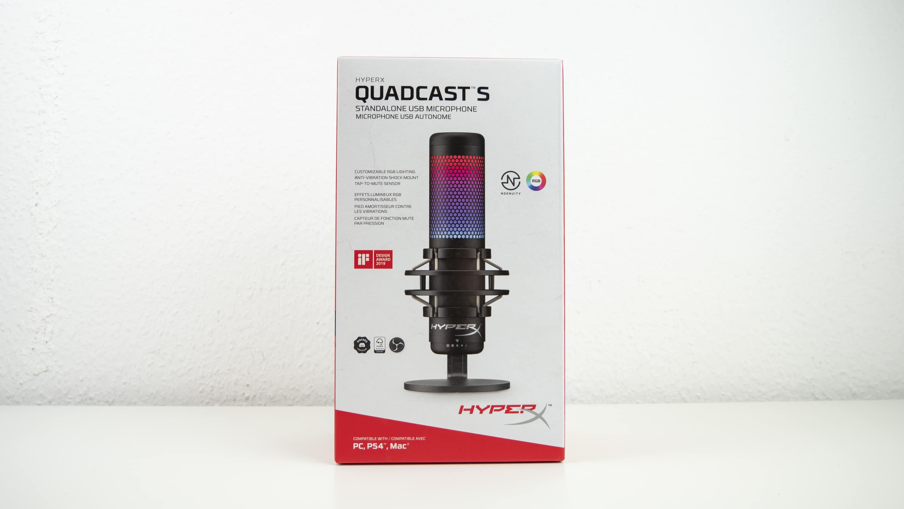 Kaum ist das Päckchen da, wird es natürlich gleich aufgemacht. Hervor kommt ein rot-weißer Karton inklusive Abbildung des Mikrofons. Im Inneren ist das QuadCast S unspektakulär verpackt – aus unserer Sicht ein Pluspunkt, da aufwendig designte Verpackungen meist vom Inhalt ablenken sollen. In diesem Fall ist dieser aber bereits ein Highlight, somit reicht die robuste Kunstoffverpackung, die das Mikrofon sicher reisen ließ, absolut aus.