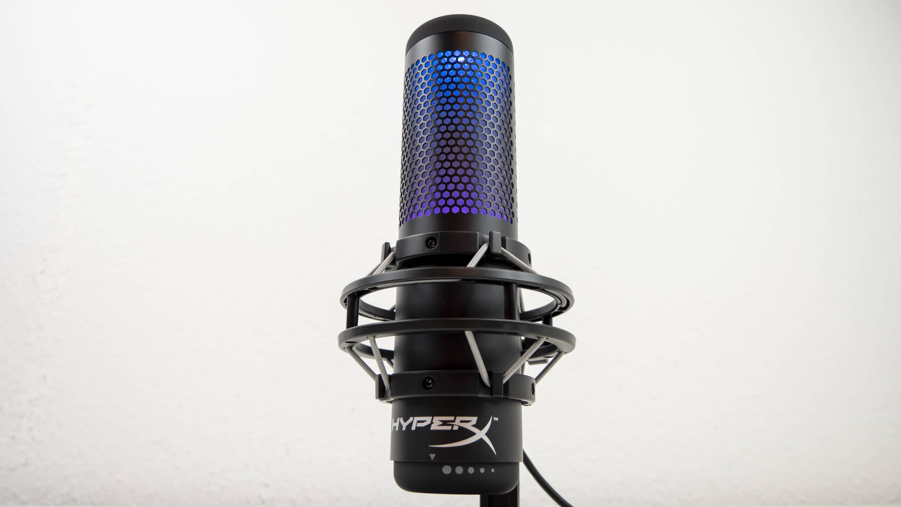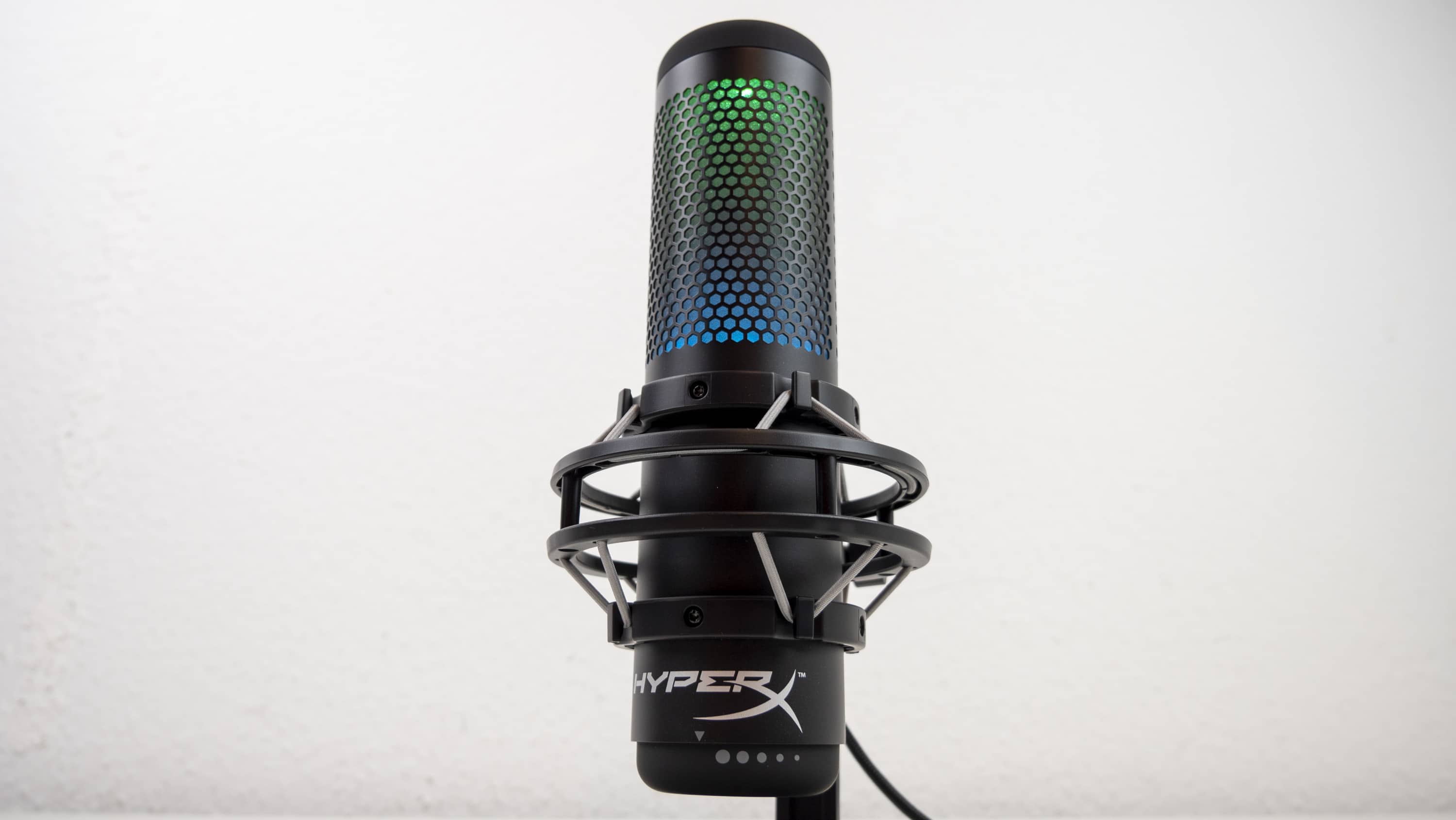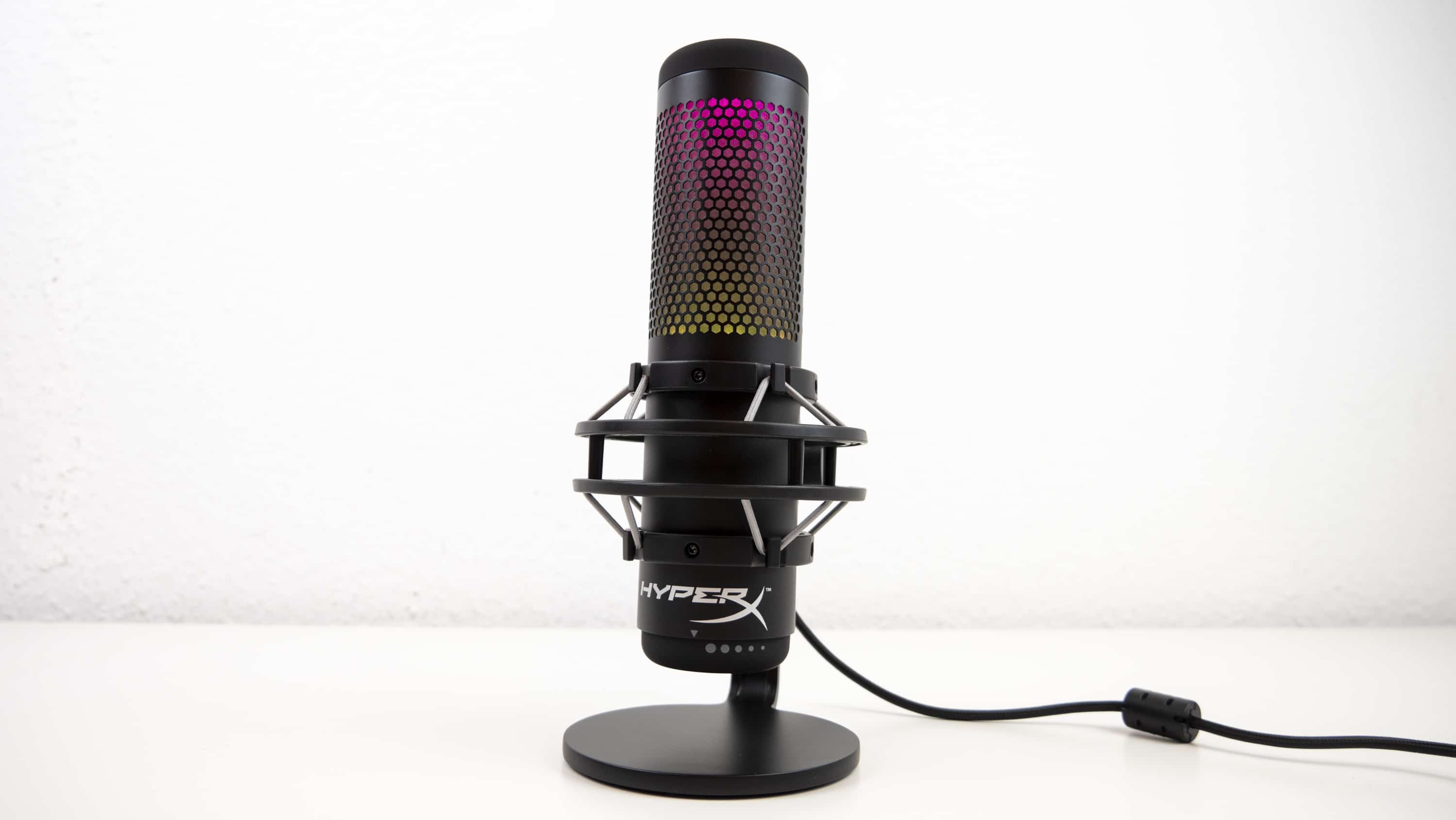 Allerdings können nur zwei Zonen der RGB-Beleuchtung angesteuert werden, nicht einzelne LEDs. Im Vordergrund stehen also dynamische Effekte, weniger feste Farbbilder. Das bringt auch kein Minus hinter die Note 1, die das QuadCast für die RGB-Bestrahlung von uns bekommt. Trotz der herausragenden Verarbeitung und Ideenumsetzung steht HyperX bezüglich RGB bei Mikrofonen schließlich fast ohne Konkurrenz dar, wodurch diese Note recht einfach zu ergattern ist. Lediglich Razer hat in seiner Seiren-Serie ein Standmikrofon, welches 8-Bit-Emotes anzeigt. Mit der dynamischen RGB-Anzeige vom QuadCast S ist das nicht zu vergleichen. Auch das Asus ROG Strix Magnus und das Trust GXT 256 Exxo sind nicht wirklich vergleichbar.