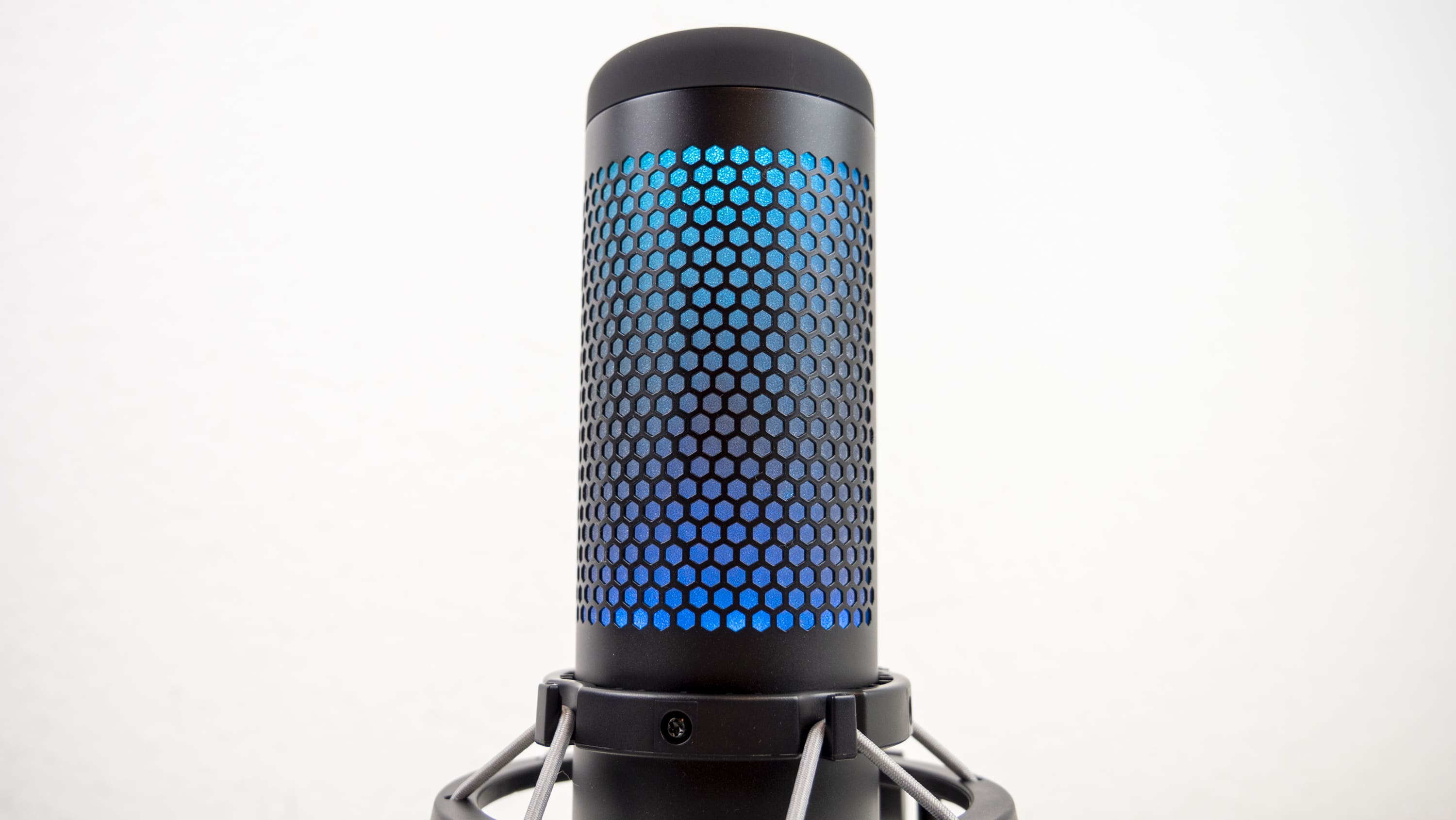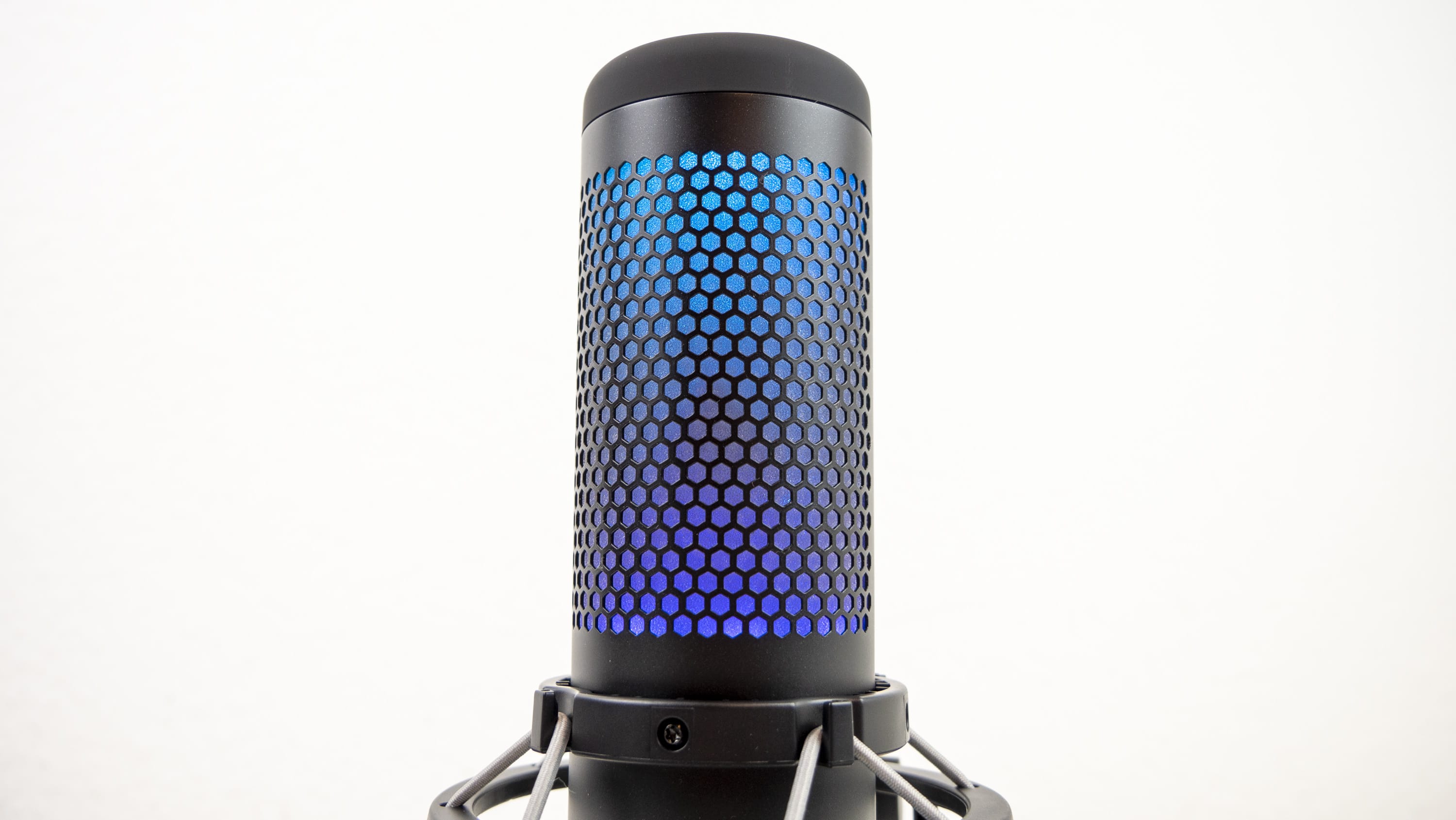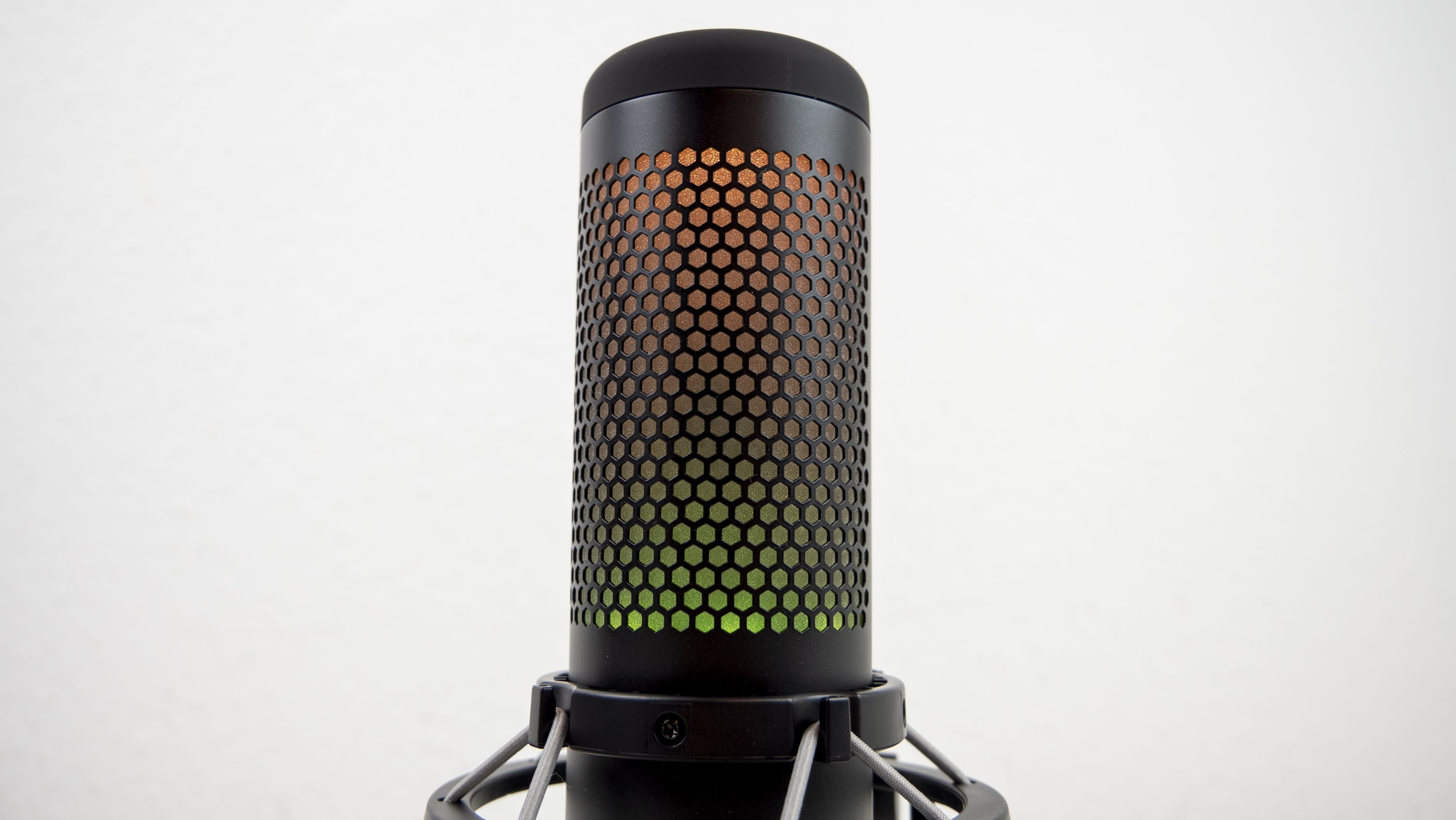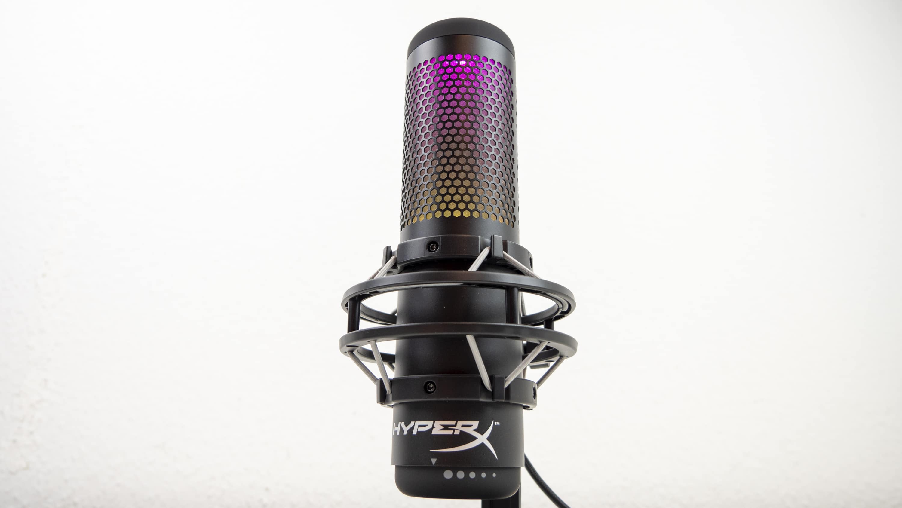 Allerdings können nur zwei Zonen der RGB-Beleuchtung angesteuert werden, nicht einzelne LEDs. Im Vordergrund stehen also dynamische Effekte, weniger feste Farbbilder. Das bringt auch kein Minus hinter die Note 1, die das QuadCast für die RGB-Bestrahlung von uns bekommt. Trotz der herausragenden Verarbeitung und Ideenumsetzung steht HyperX bezüglich RGB bei Mikrofonen schließlich fast ohne Konkurrenz dar, wodurch diese Note recht einfach zu ergattern ist. Lediglich Razer hat in seiner Seiren-Serie ein Standmikrofon, welches 8-Bit-Emotes anzeigt. Mit der dynamischen RGB-Anzeige vom QuadCast S ist das nicht zu vergleichen. Auch das Asus ROG Strix Magnus und das Trust GXT 256 Exxo sind nicht wirklich vergleichbar.