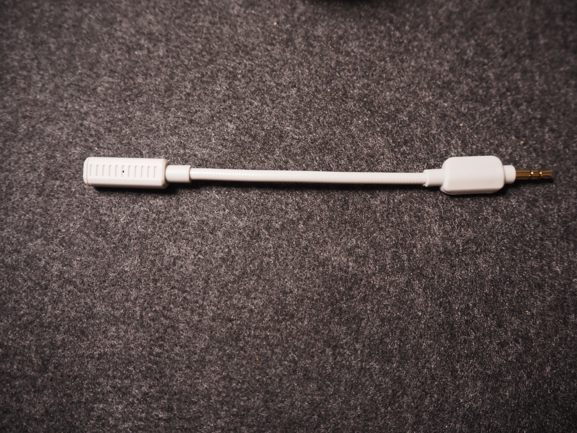 Den größten Teil der Verpackung nimmt natürlich das Headset selbst ein. Ebenfalls enthalten ist ein 2,4-GHz-USB-A-Dongle in matt-grauer Farbe, sowie ein USB-A- auf USB-C-Kabel mit einer Länge von 1,8 Metern. Die obligatorische Anleitung und der hellgraue Mikrofonarm runden den Lieferumfang ab.