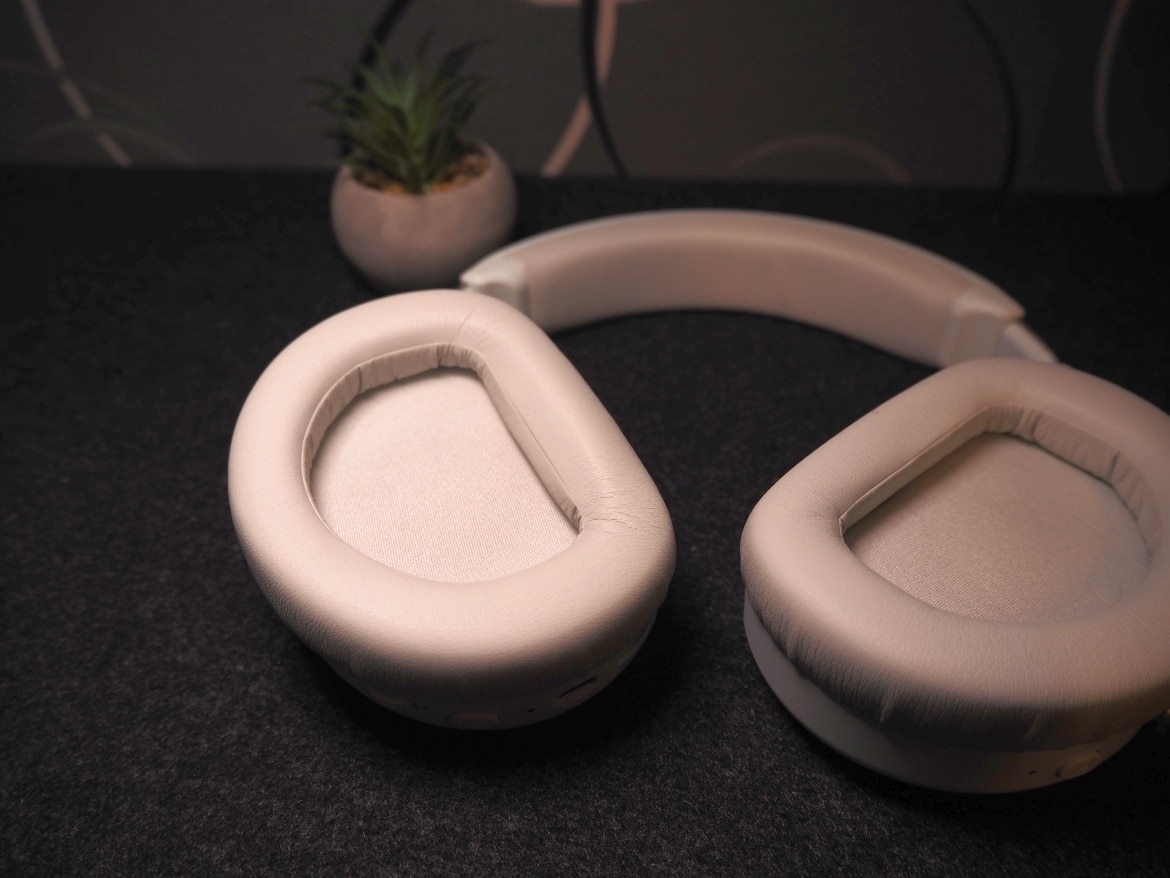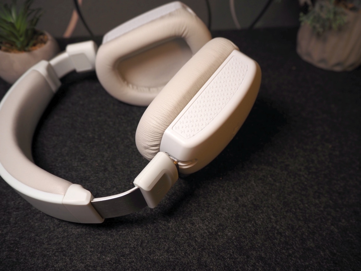 Minimal dunkler präsentieren sich die Ohrpolster aus veganem Leder und das großzügige Schaumstoff-Kopfband. Die Ohrmuscheln sind vollständig nach außen und minimal nach innen drehbar, sowie nach innen neigbar. Der Kopfbügel weist eine angenehme Rasterung auf, die allerdings nicht beschriftet ist. Insgesamt lässt sich die Größe in sieben Stufen anpassen.