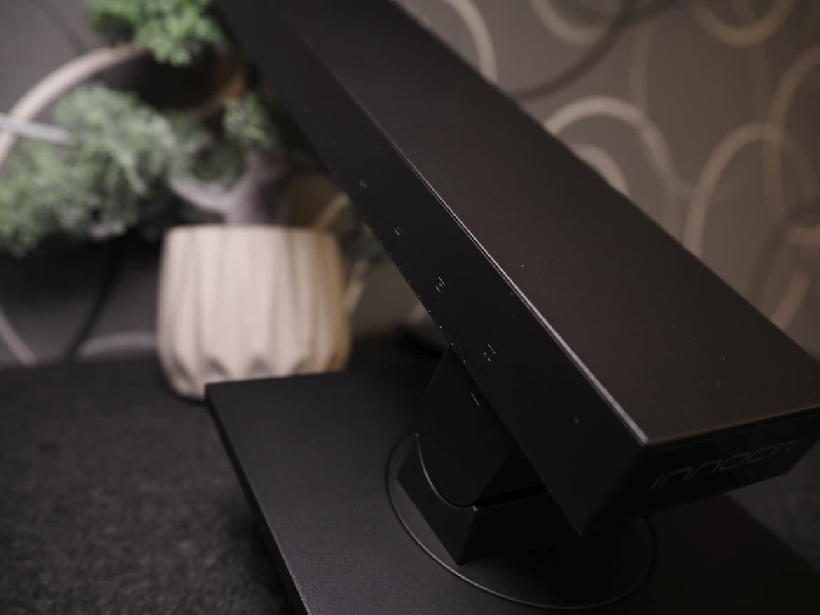 Als angenehm empfinde ich zudem die quadratische Basis, auf der der InnoCN 27C1U ruht. So kommen wir insgesamt auf eine Tiefe von 194 mm, womit der Monitor auch auf schmaleren Ablageflächen Platz findet und zudem gut ausbalanciert ist.