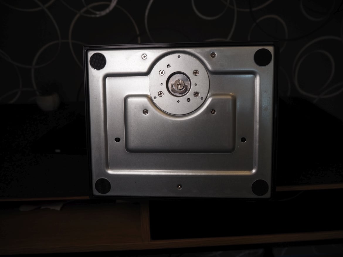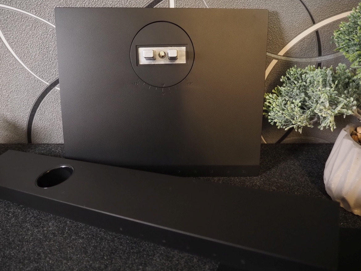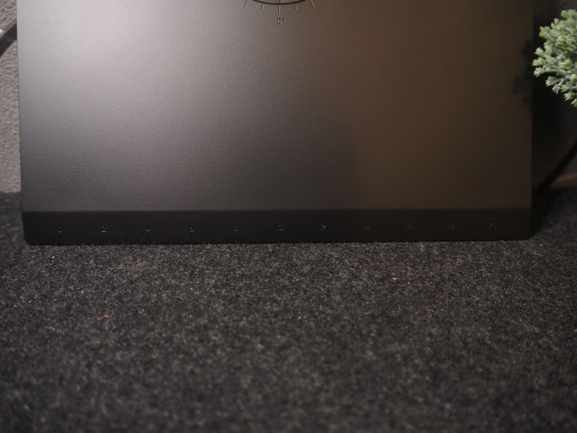 Löblich: Am rechten Rand der Front finden wir Symbole, die die Position und Nutzung der an der Unterseite verbauten Tasten aufzeigen. Die Basis des Standfußes, Höhenverstellung und Front des Standfußes weisen zudem Zahlen auf, an denen sich der Winkel der Drehung oder die Höhe schnell ablesen lässt. Ein nettes und durchaus praktisches Detail. Die Zahlenreihe (in 2er Schritten von 0 bis 20) an der Vorderseite erschließt sich mir jedoch nicht.