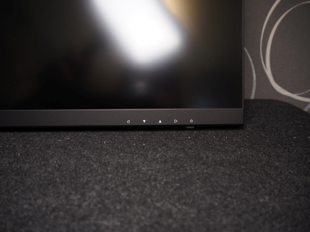 Der Standfuß weist im unteren Drittel ein großes Loch auf, durch das sich Kabel platzsparen führen lassen. An der Unterseite finden wir, in mittiger Position, die verschiedenen Anschlüsse. Am rechten Rand hingegen sitzen die fünf Tasten, mit denen der Monitor bedient wird. Die Power-Taste (ganz rechts) leuchtet im eingeschalteten Zustand zudem blau, bei der Bilddarstellung weiß.