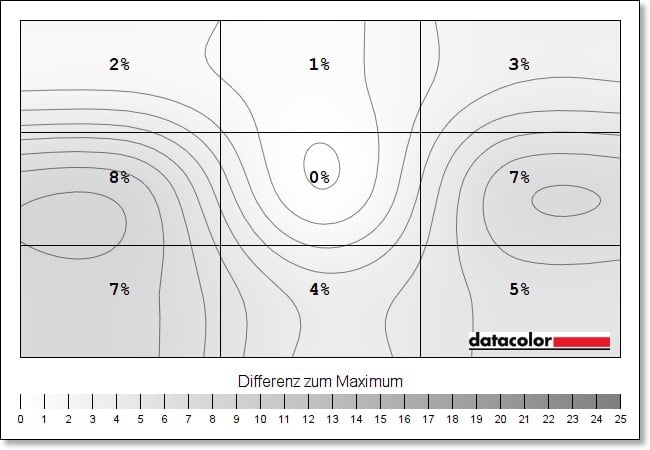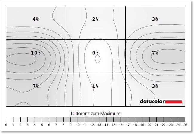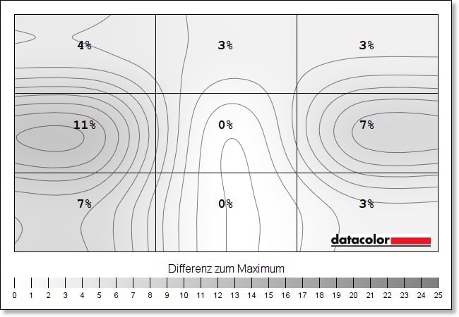 Die Luminanzhomogenität liegt ebenfalls auf sehr gutem Niveau, zeigt allerdings im mittleren Quadrat am linken Rand die größte Abweichung mit teils bis zu 11 Prozent (bei 50 Prozent Helligkeit). Im Zentrum sieht es hingegen deutlich besser aus.