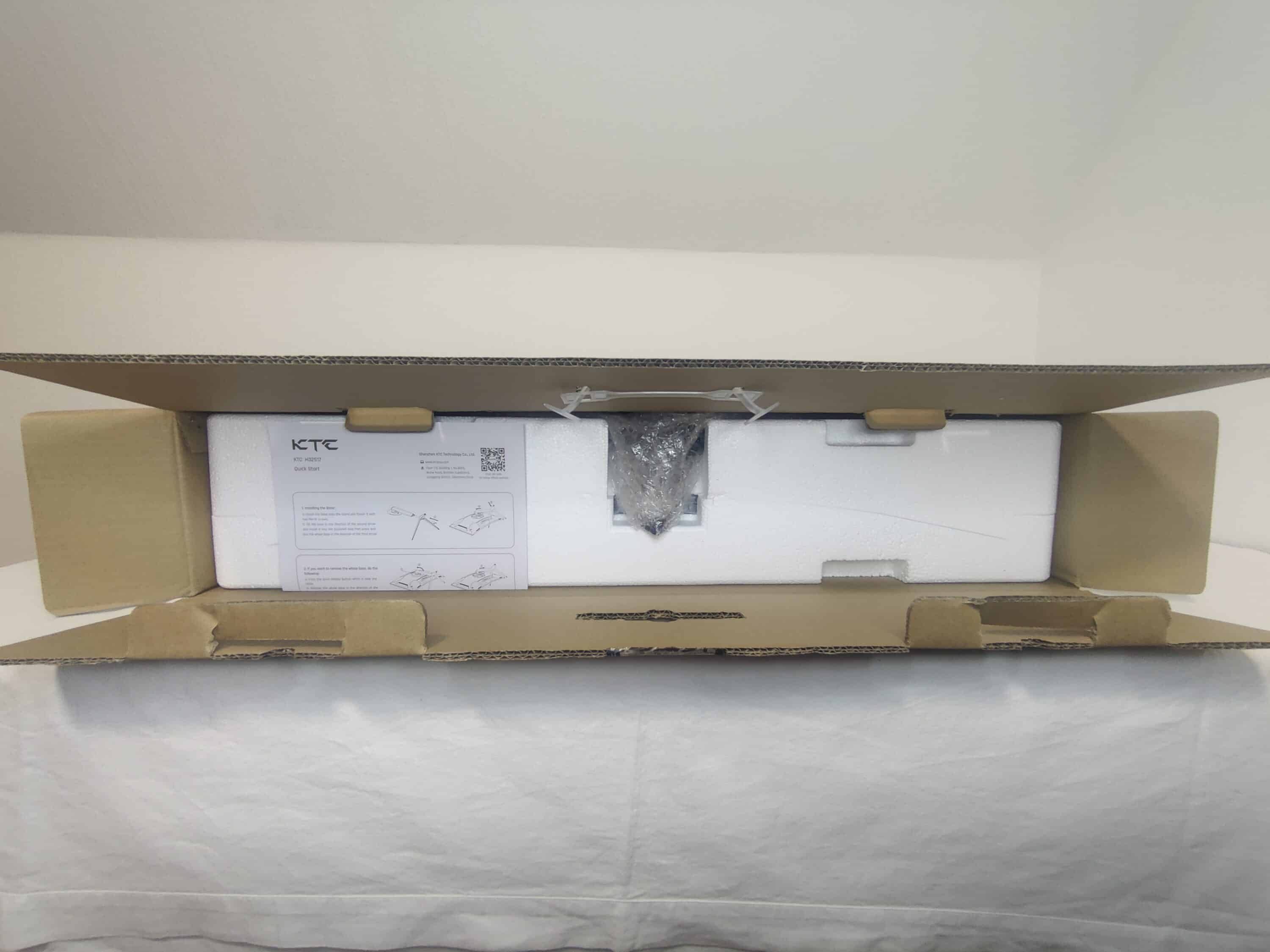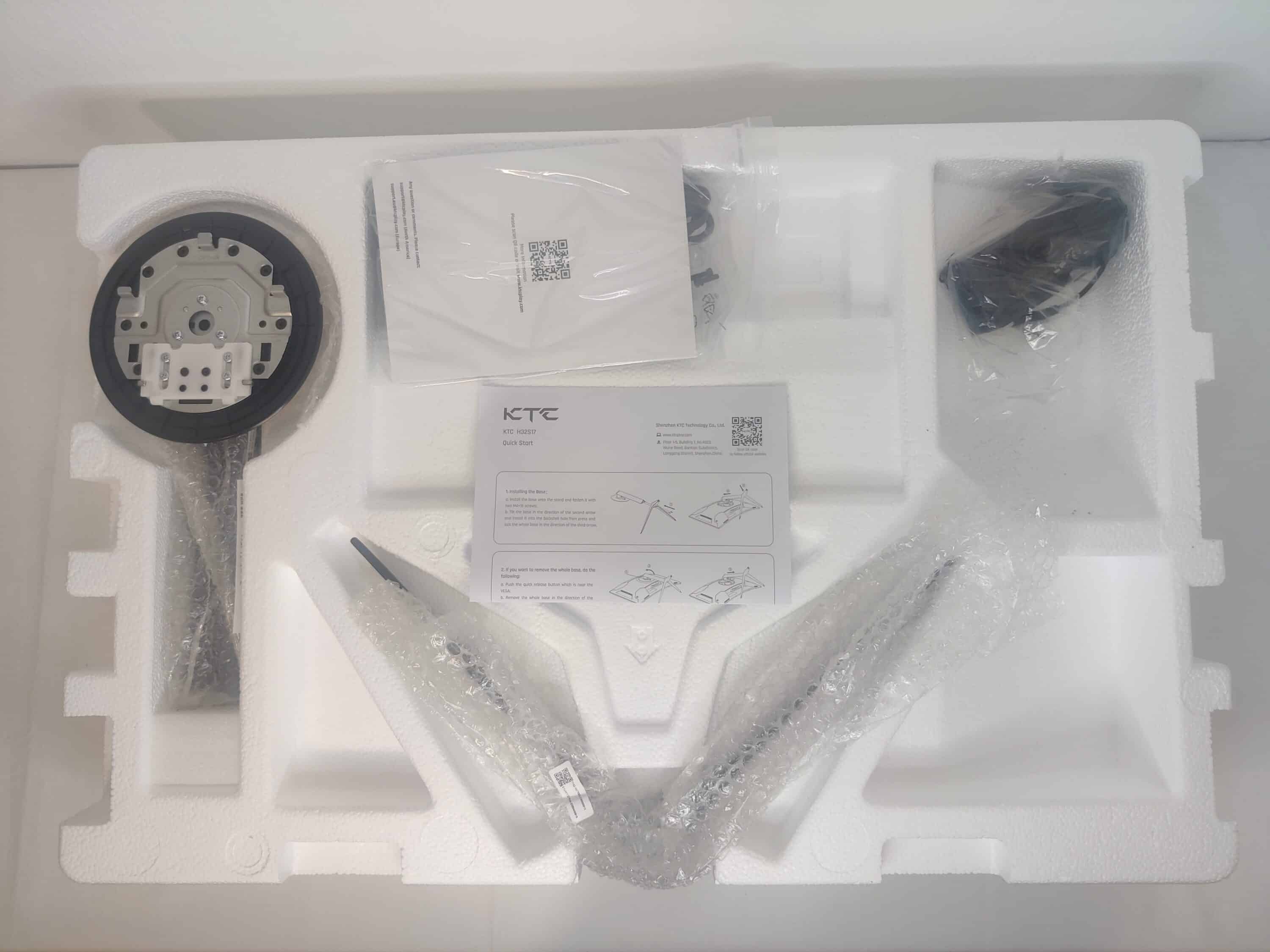 KTC liefert den H32S17 in einem braunen, unauffälligen Karton aus. Das Firmenlogo ist auf der Vorderseite des Kartons abgebildet. Betrachten wir nun das Innenleben, so kommt uns zu Beginn recht viel Styropor entgegen. Dies ist natürlich sinnvoll um den Monitor von jeglichen Seiten vor Lieferschäden zu schützen. Beim Entpacken der Teile fällt auf, dass jegliche Komponenten einzeln in einer Folie verpackt sind. Der Standfuß ist darüber hinaus von Luftpolsterfolie umhüllt und setzt sich aus zwei Teilen zusammen.