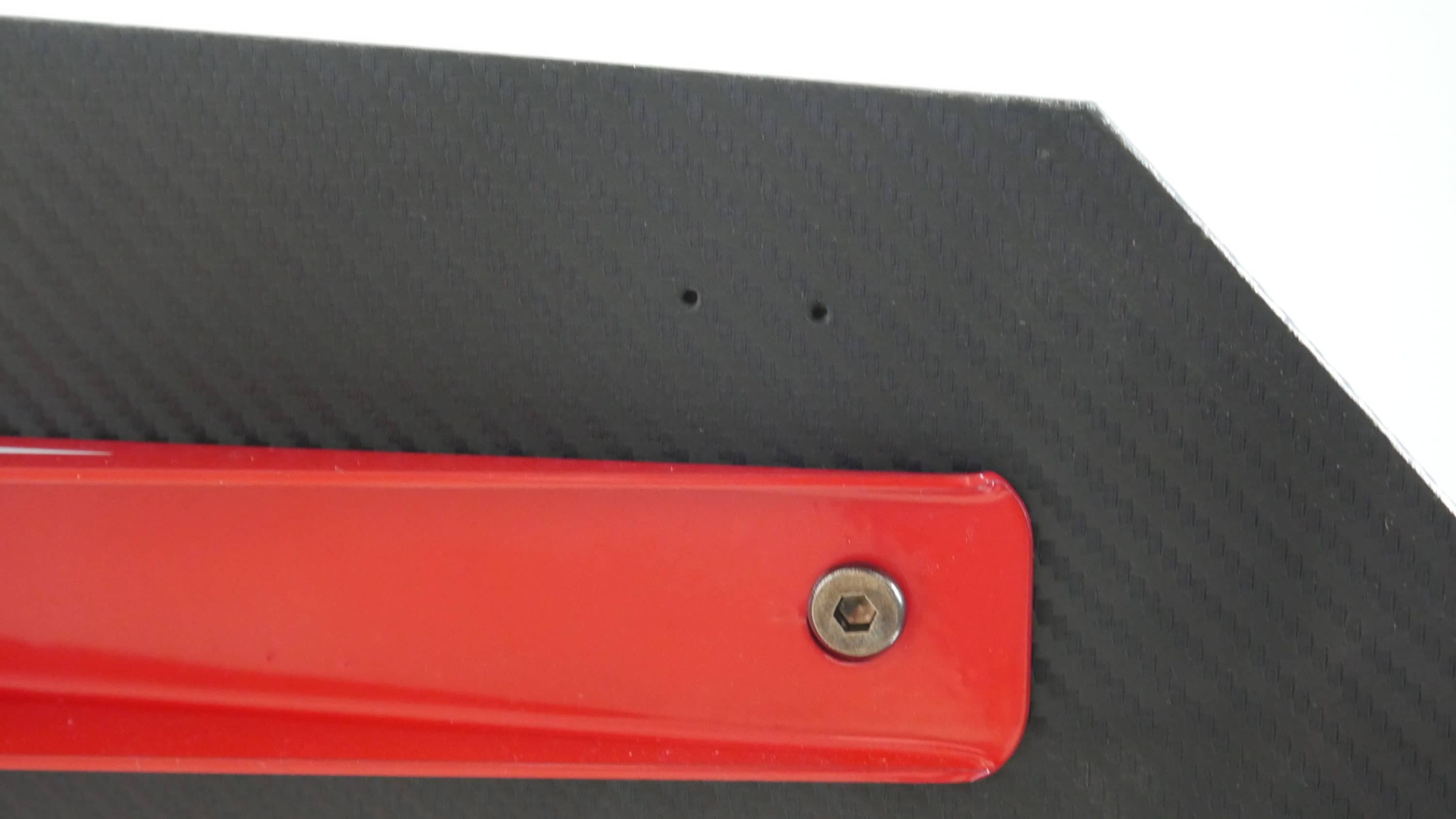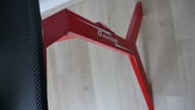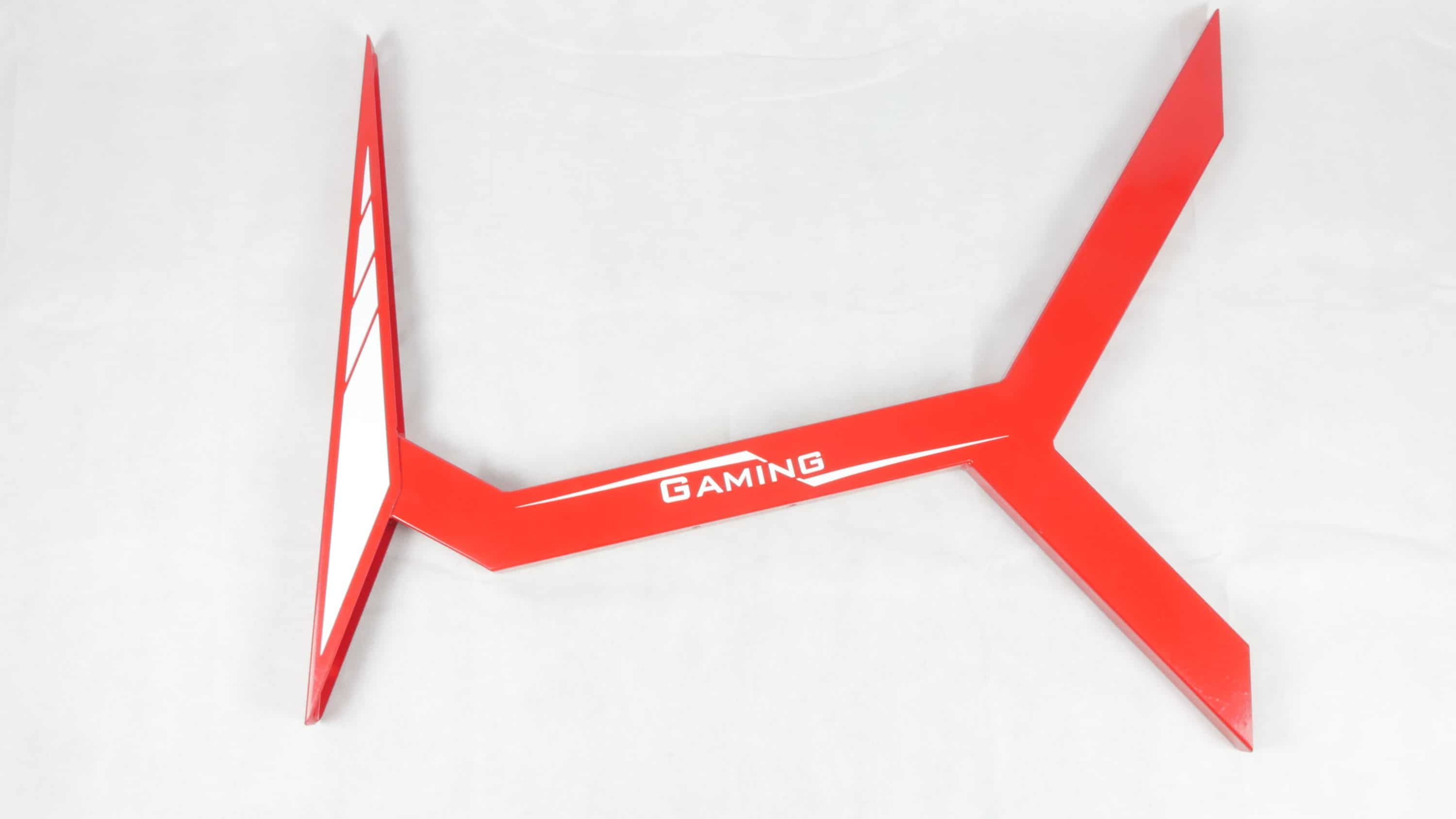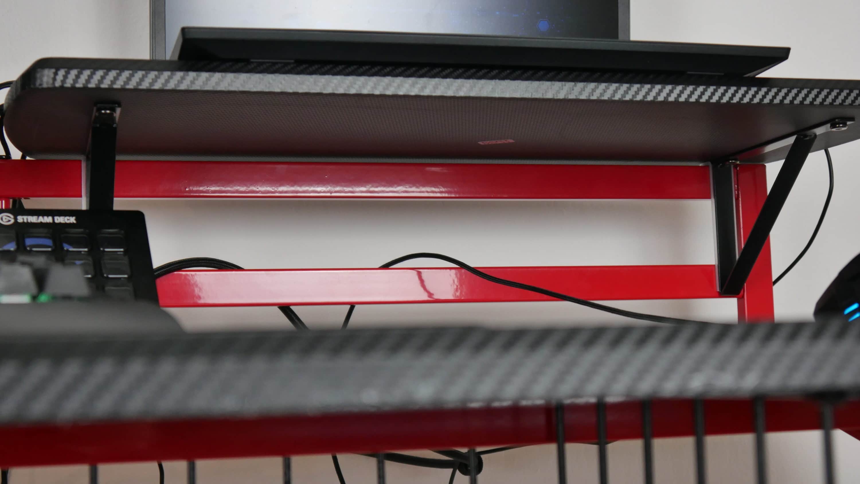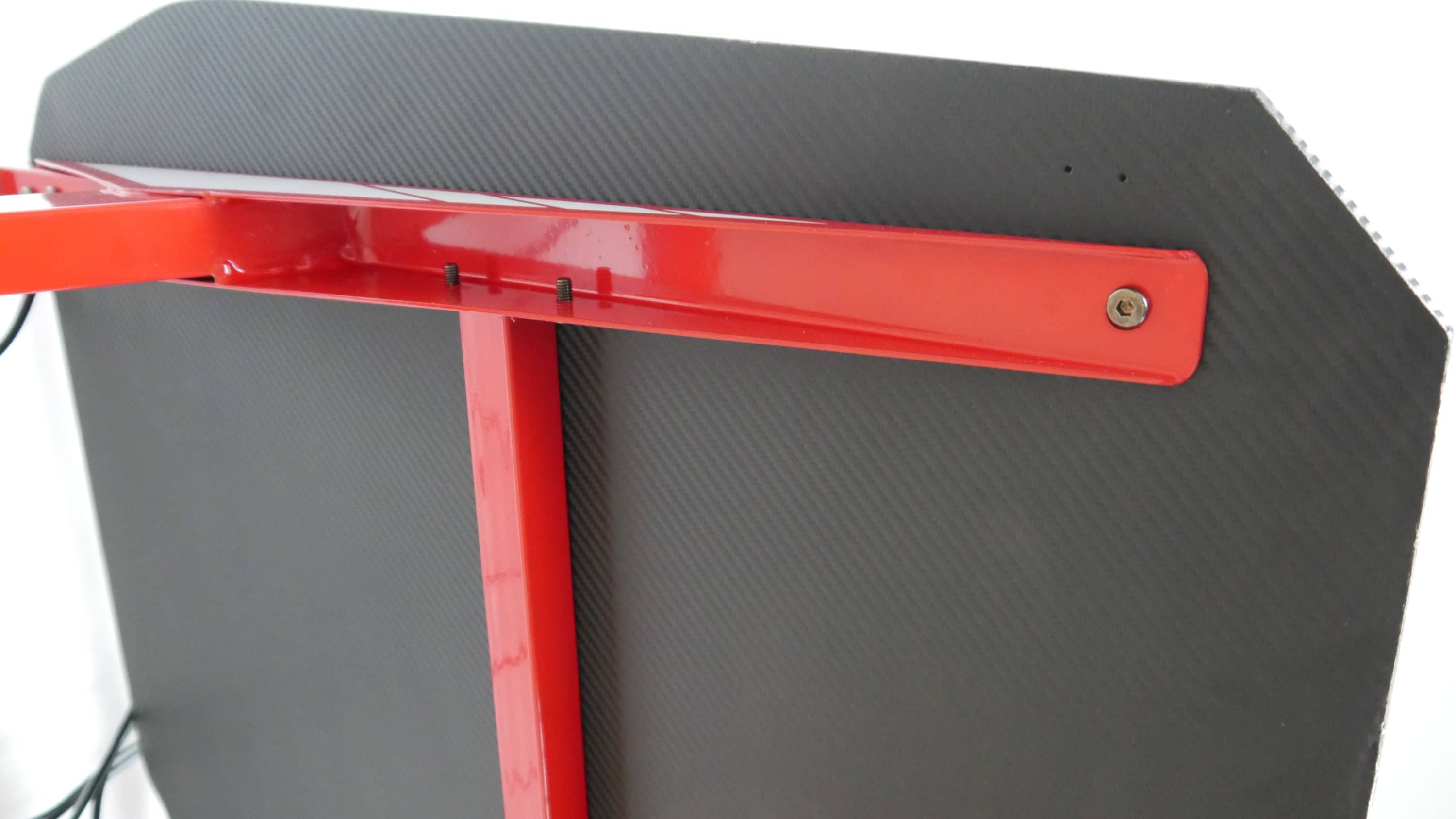Beim Design des Gaming-Tisches von LC-Power wurde etwas um die Ecke gedacht. An vielen Stellen befinden sich Ecken und Kanten statt Abrundungen. Dadurch entsteht aber ein sehr cooler und außergewöhnlicher Look, der uns gut gefällt. Die Y-Form der Beine ist ebenfalls von dem kantigen Design geprägt und sorgt zusätzlich noch für die Stabilität. Die Farbe Rot passt sehr gut zu der Carbon-Faser-Optik-Struktur der Oberfläche und bringt viel Farbe ins Gesamtpaket. Die Verarbeitung der Metallstreben und die Passgenauigkeit für die Schrauben ist gut, sodass man nichts verbiegen muss, um den Tisch aufzubauen. Die Abstellvorrichtungen für die Monitore sind stabil, obwohl sie nur eingehängt werden. Die Qualität der Tischplatte ist gut und die Oberfläche weist keine Mängel auf.
