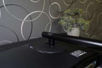 Unten findest du dann auch, neben den Luftauslässen, die Bedienelemente am rechten Rand. Fünf Knöpfe an der Zahl, wobei der ganz rechte (der An- und Ausschalter) mit einer zusätzlichen Riffelung daherkommt. Damit unterscheidet er sich von allen anderen Knöpfen und du kannst bereits erfühlen, ob du den richtigen Butten gedrückt hast. Daneben sitzt eine kleine LED, die im laufenden Betrieb einen blauen Punkt auf den Schreibtisch bzw. deine Unterlage erstrahlen lässt.