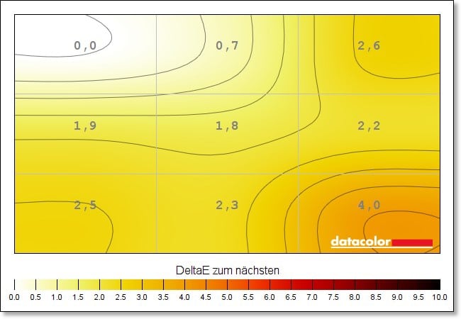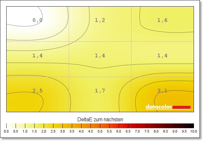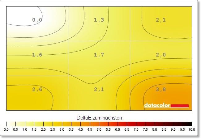 Bei der Farbhomogenität sieht es hingegen wieder deutlich besser aus. Während die obere linke Ecke perfekt abgestimmt ist, halten sich die Abweichungen mit maximal DeltaE 4,0 bei 83 Prozent Helligkeit in der unteren Rechen Ecke stark in Grenzen.
