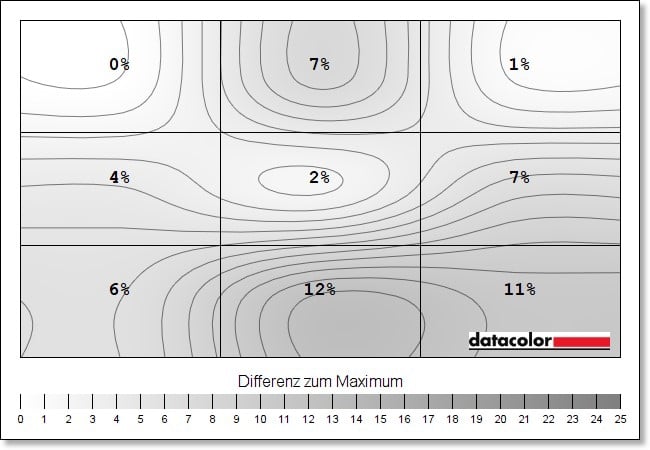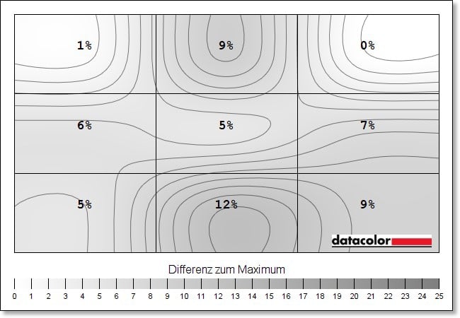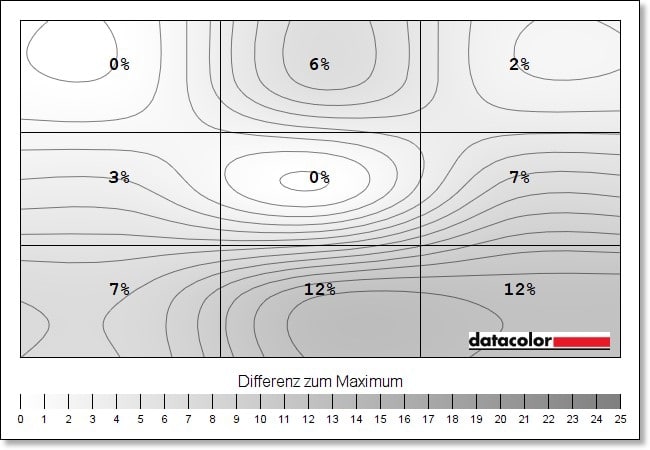 Auch die Luminanzhomogenität, also die gleichmäßige Ausleuchtung des Displays, weicht nicht so stark aus, wie beim flachen Geschwistermodell. Wenngleich hier bis zu 12 Prozent noch immer recht viel sind. Für einen derart günstigen Monitor gehen die Werte aber absolut in Ordnung.