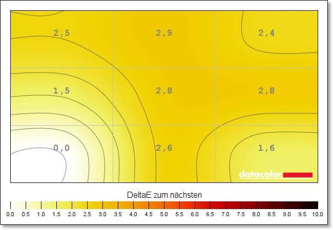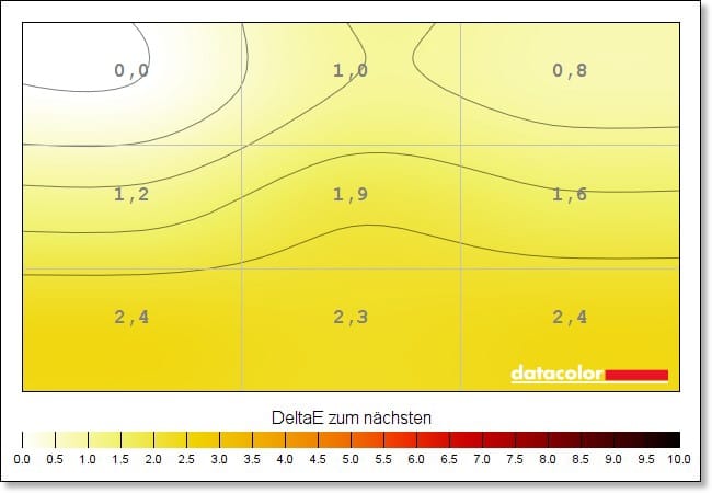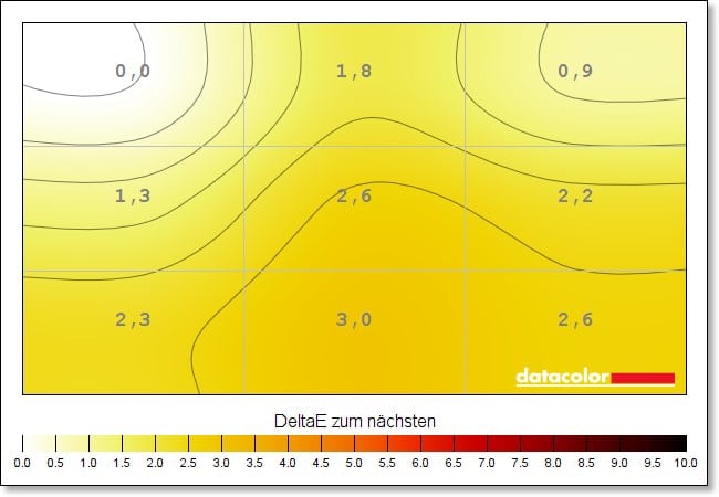 Gute Ergebnisse erzielt der Monitor dann auch bei der Farbhomogenität und das über sämtliche gemessenen Helligkeitsstufen hinweg und jeweils natürlich in den Standardeinstellungen. Nirgendwo kommen wir hier auf einen Wert von mehr als DeltaE 3,2 – vor allem bei voller Helligkeit und bei einem Wert von 83 Prozent überzeugen die Werte.