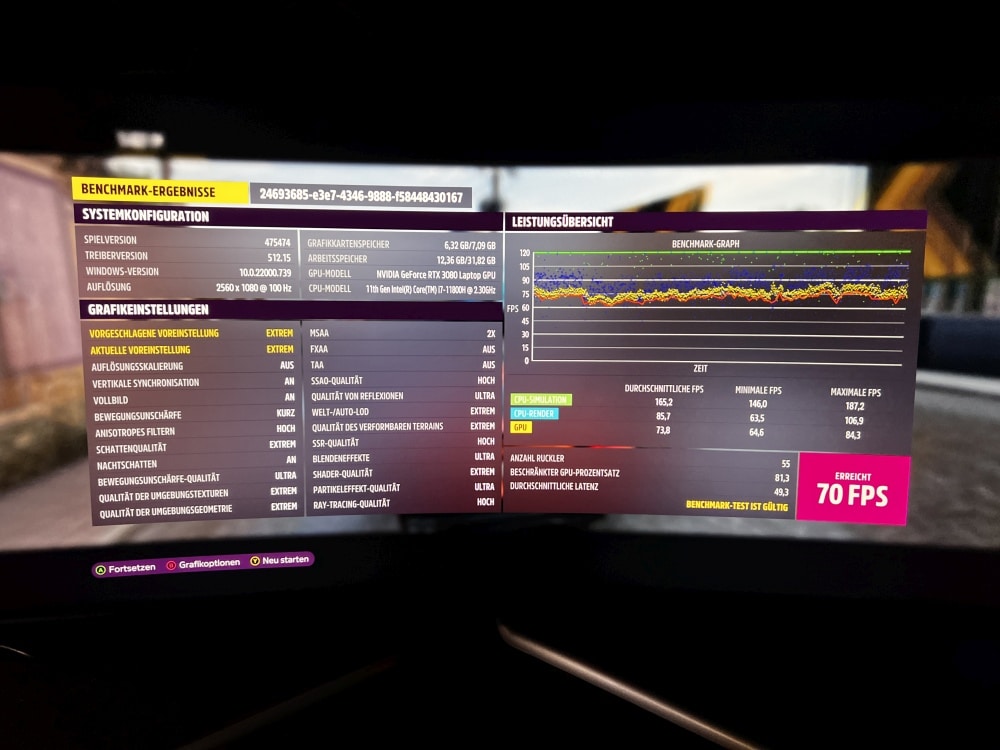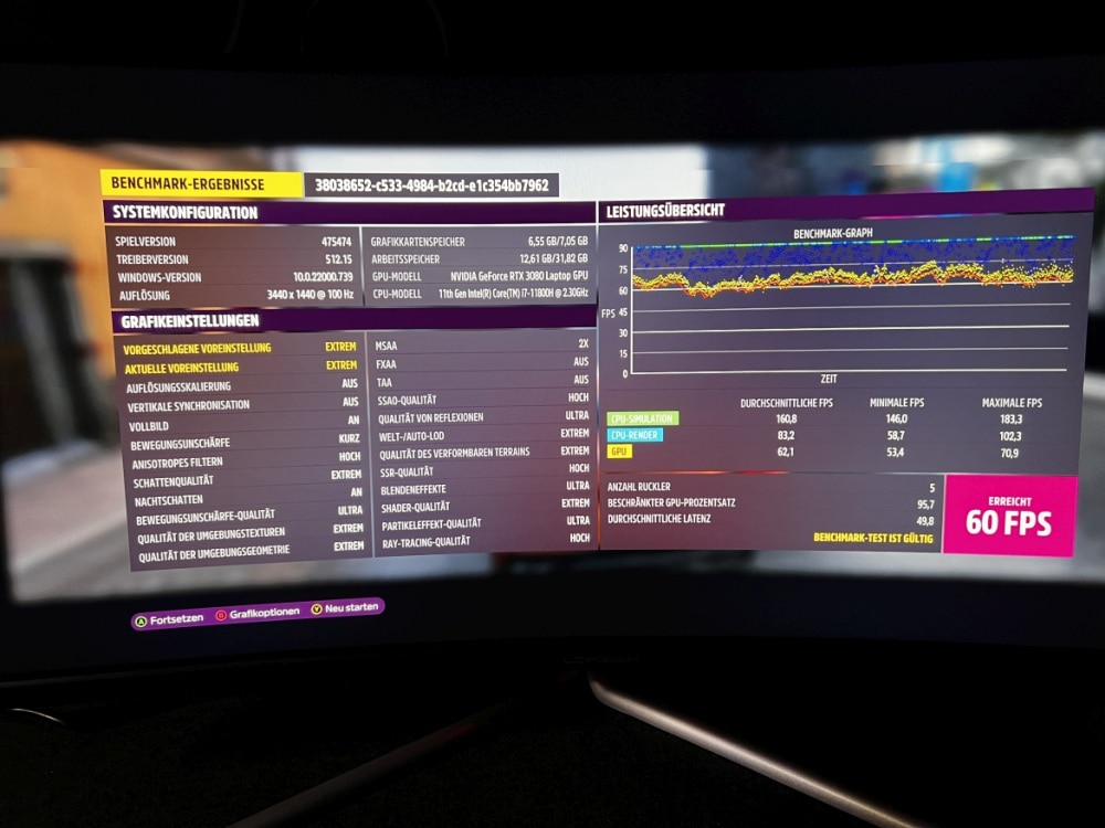 Allerdings setzt eine Auflösung von 3.440 x 1.440 Pixeln auch eine wirklich potente Hardware voraus. In Forza Horizon 5 beispielsweise kam ich mit UWQHD-Auflösung auf maximal 60 FPS, in WQHD hingegen auf 67 FPS. In anderen Spielen fällt der Unterschied noch deutlicher aus.