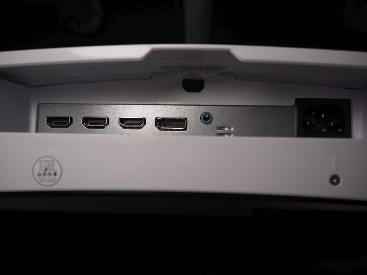 Stichwort Anschlüsse. Diese finden also auf der Unterseite des Monitors Platz. Konkret stehen hier die folgenden Ports zur Verfügung: