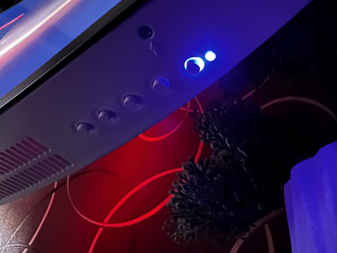Von den Anschlüssen aus wandern wir an der unteren Seite zum rechten Rand des Monitors, wo LC-Power die Bedienelemente, bestehend aus fünf physischen Knöpfen und einer Indikatorleuchte, platziert.