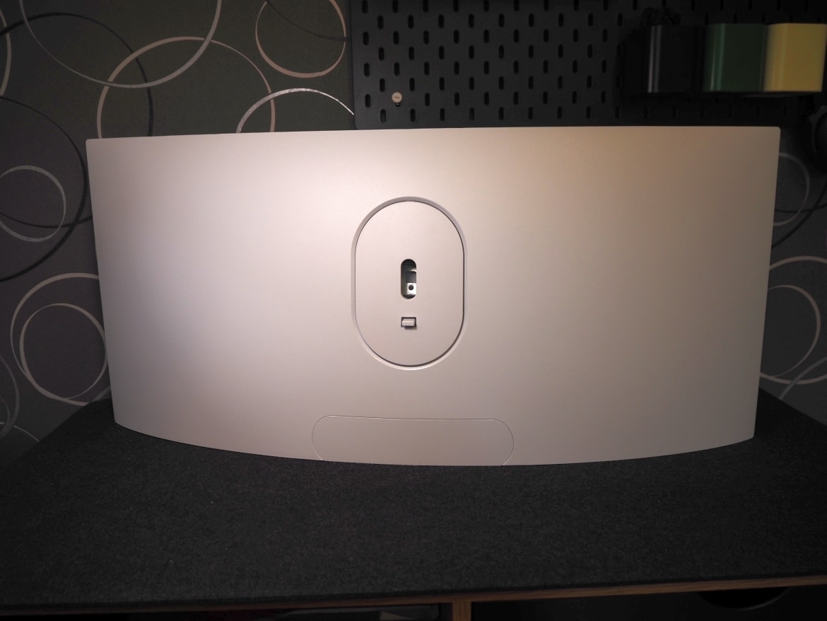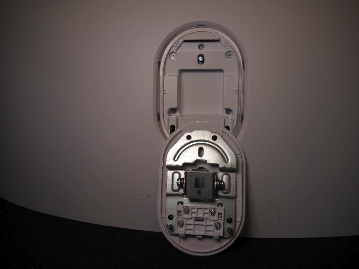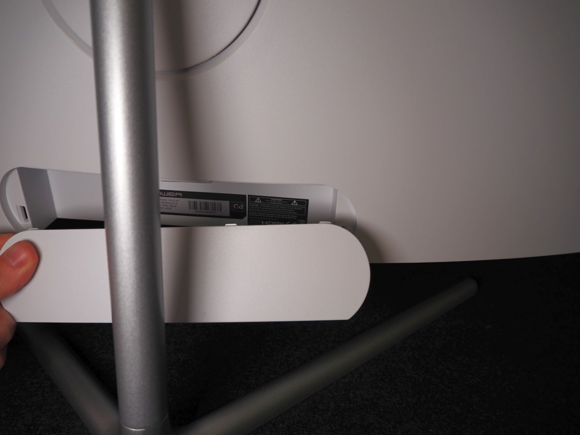 Am unteren Rand finden wir eine Abdeckung, die einen leichteren Zugang zu den Anschlüssen ermöglicht, falls wir nicht die Option haben, diese von unten zum Monitor zu führen. Sie lässt sich auf Wunsch einfach abnehmen.