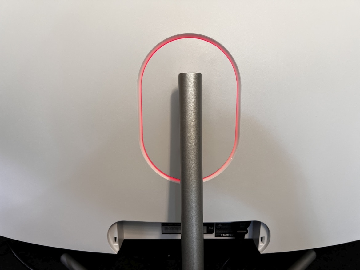 An der Rückseite gibt es nichts zu sehen. Wobei: So ganz stimmt das nicht. Hier findet, natürlich, zentral der Standfuß Halt, wobei sich der LC-M34 optional auch mit einer 75 x 75 mm VESA-Aufhängung an die Wand montieren lässt. Hinzu gesellt sich, in der Mitte, eine rundliche RGB-Beleuchtung, die allerdings nur in roter Farbgebung erstrahlt.
