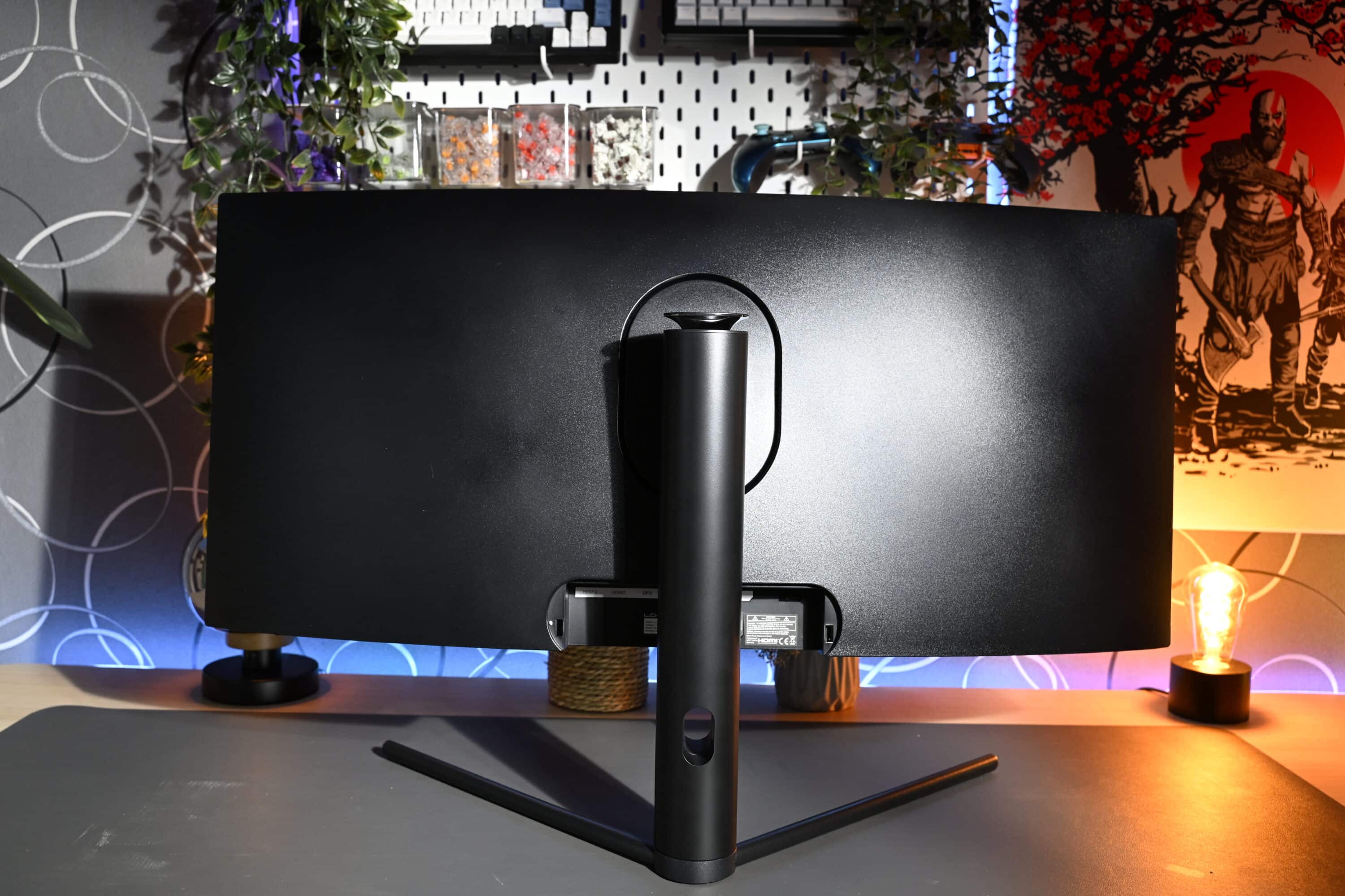 Und dann steht er vor dir. Ein recht wuchtiger, ultrabreiter 34-Zoll-Monitor, der mit einem Gewicht von rund 8 Kilogramm recht leicht ausfällt. Das liegt an der Kunststoffbauweise, die das Gewicht natürlich niedrig hält, sich aber nicht so robust anfühlt, wie bei der teureren Konkurrenz.