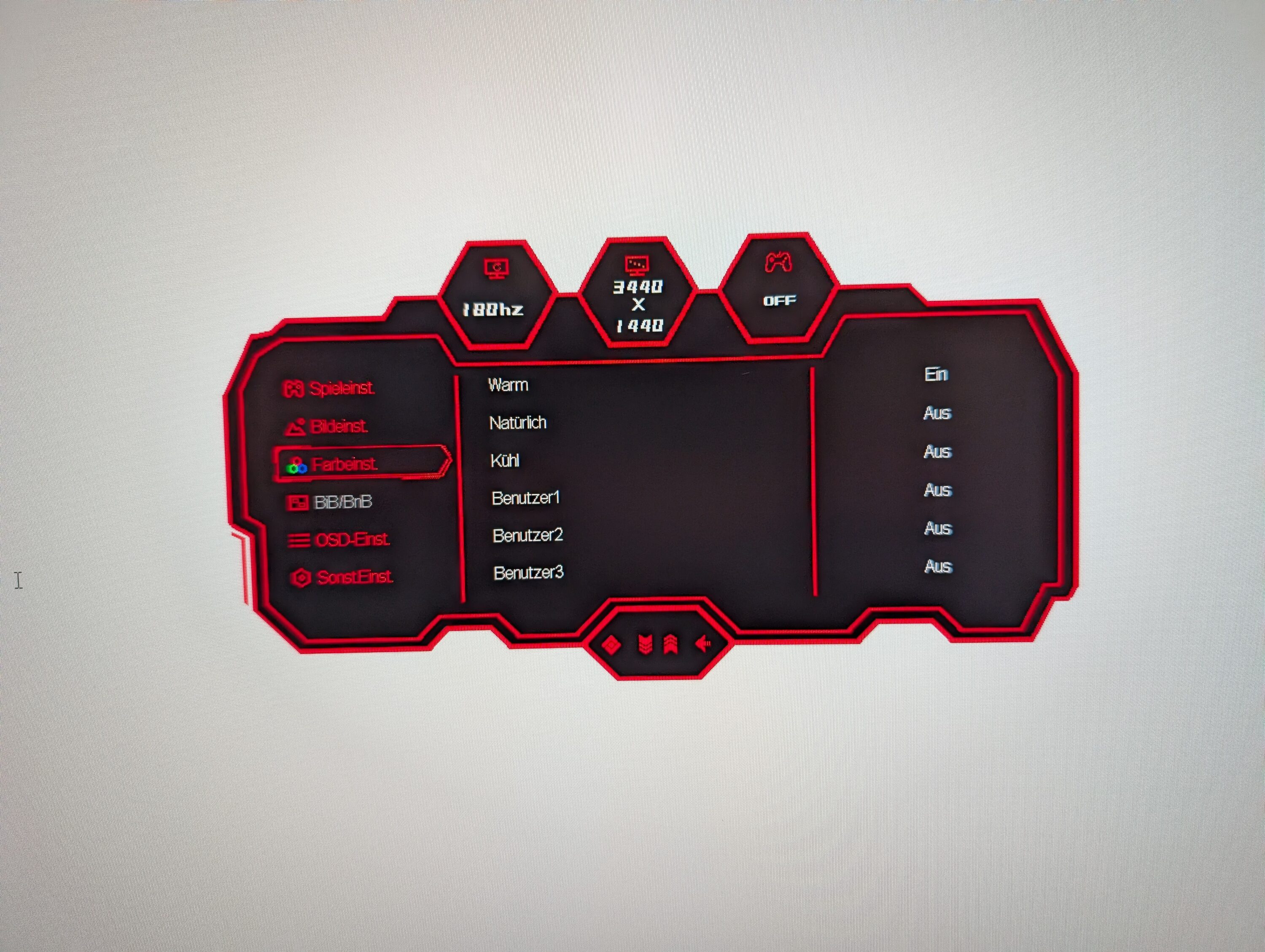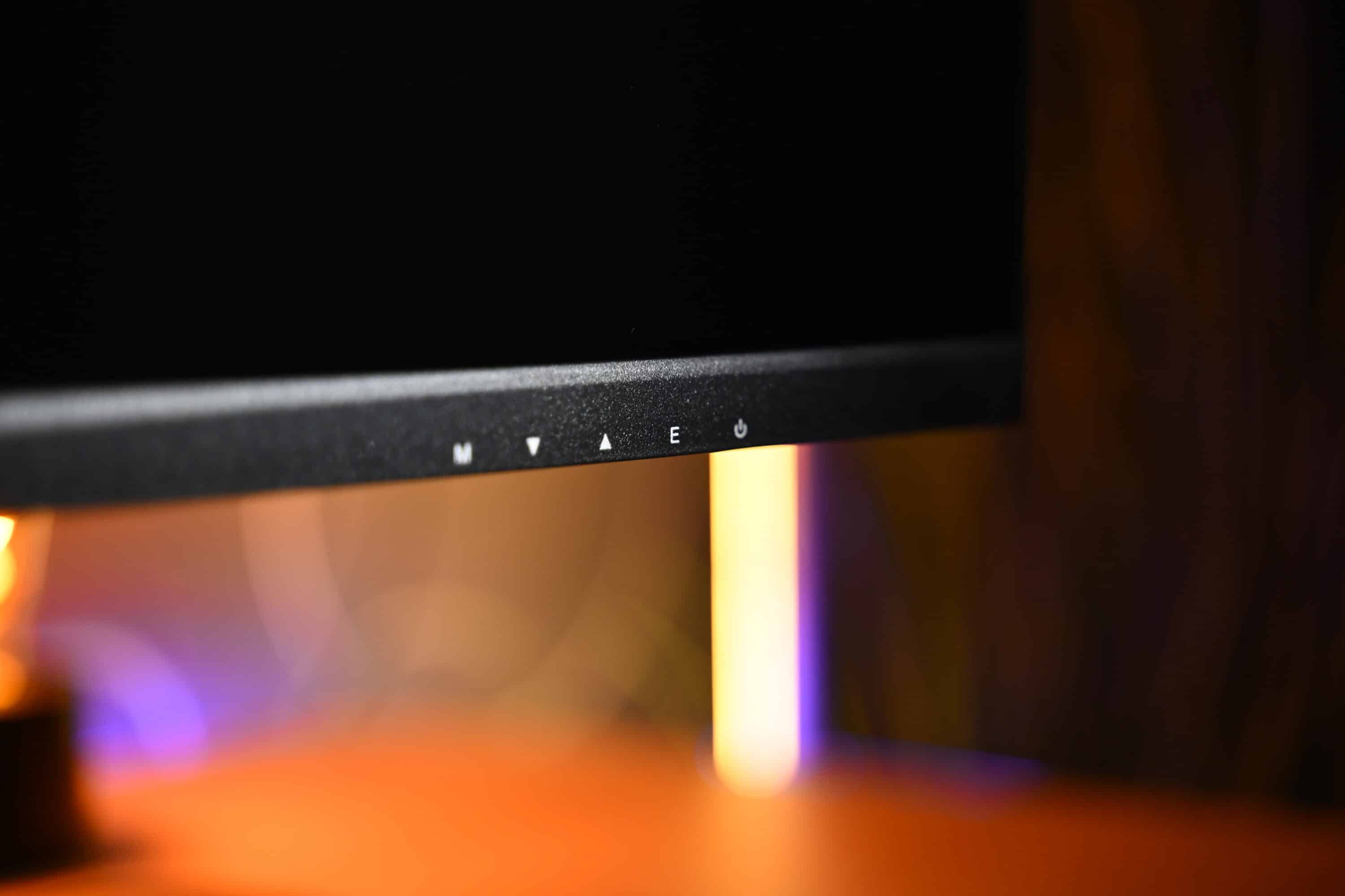 Mit der linken Taste gelangst du in das On-Screen-Display (OSD) und dort in das nächste Untermenü, mit den Tasten daneben navigierst du nach oben oder unten. Die „E-Taste“ geht im Menü einen Schritt zurück, während der Power-Button ganz rechts Platz findet. Selbsterklärend und simpel.