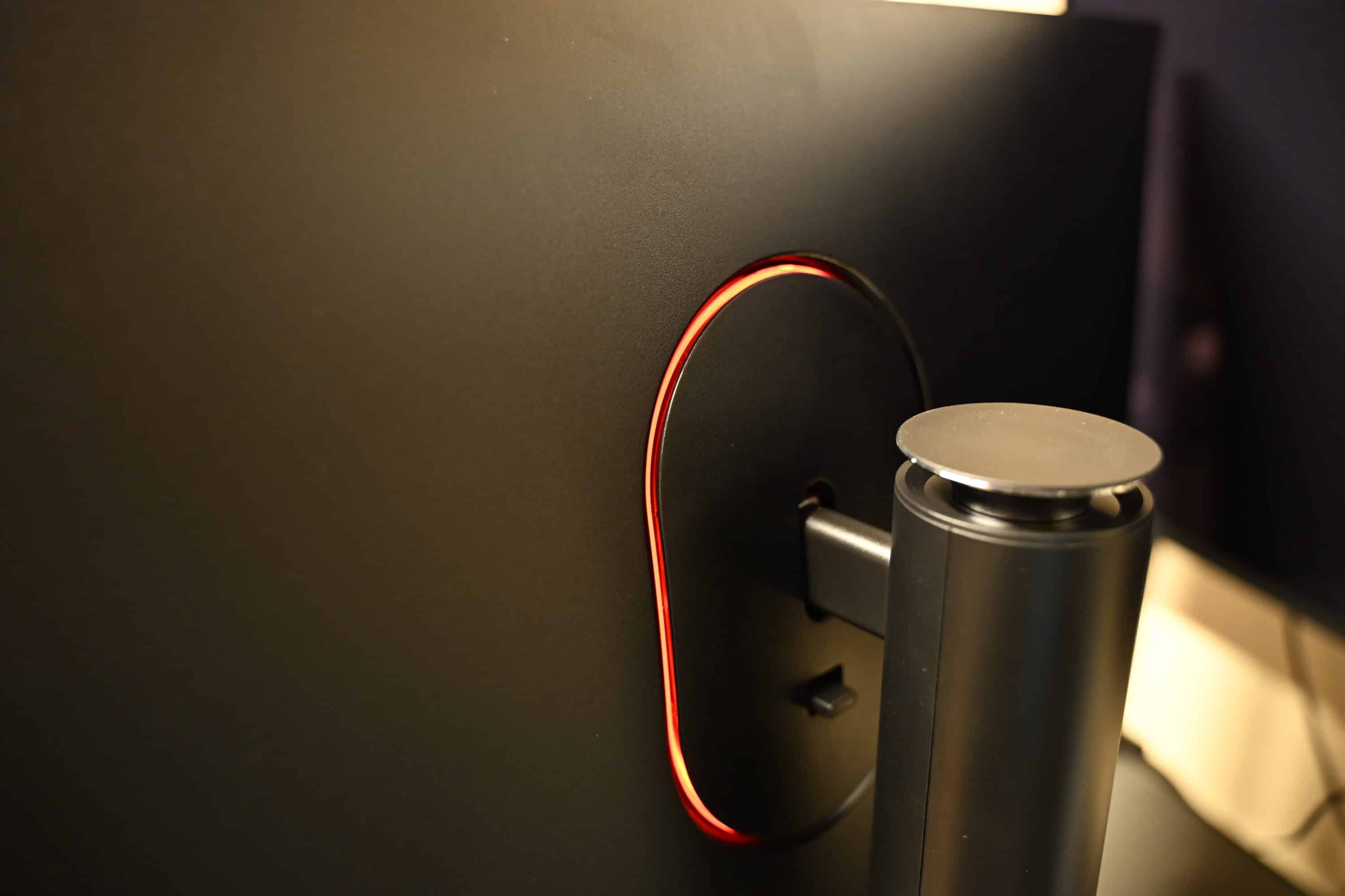Der Monitor setzt dabei auf einen schwarzen Kunststoff-Rahmen mit einem dreiseitig rahmenlosen Display. Um den Standuß erstreckt sich ein farbiger Leuchtring, den wir in der Form bereits aus den Vorgängermodellen kennen. Dieser leuchtet im Betrieb rot und ist nicht anpassbar. Wer mag, kann das Licht aber auch ausschalten.