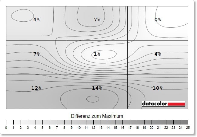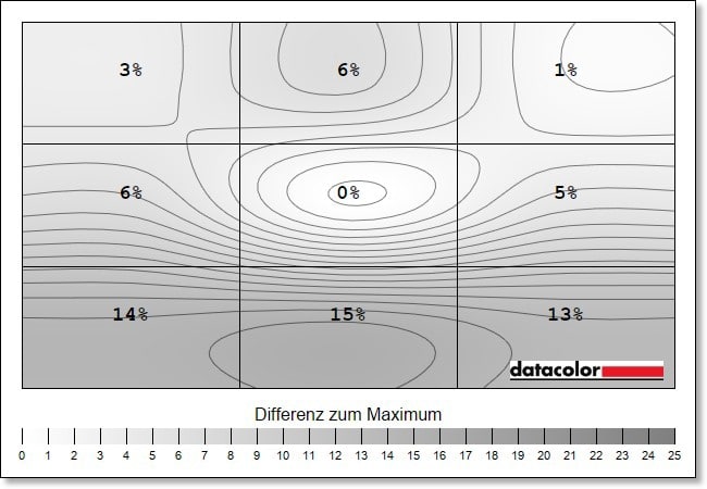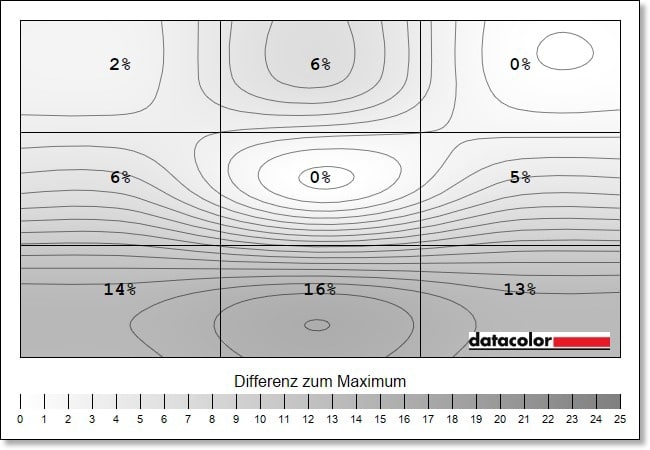 Etwas anders verhält es sich mit der Luminanz-Homogenität. Während das obere Drittel über alle Helligkeitsstufen hinweg gute Resultate erzielt, fallen die Abweichungen im unteren Drittel mit bis zu 16 Prozent schon sehr hoch aus.