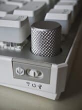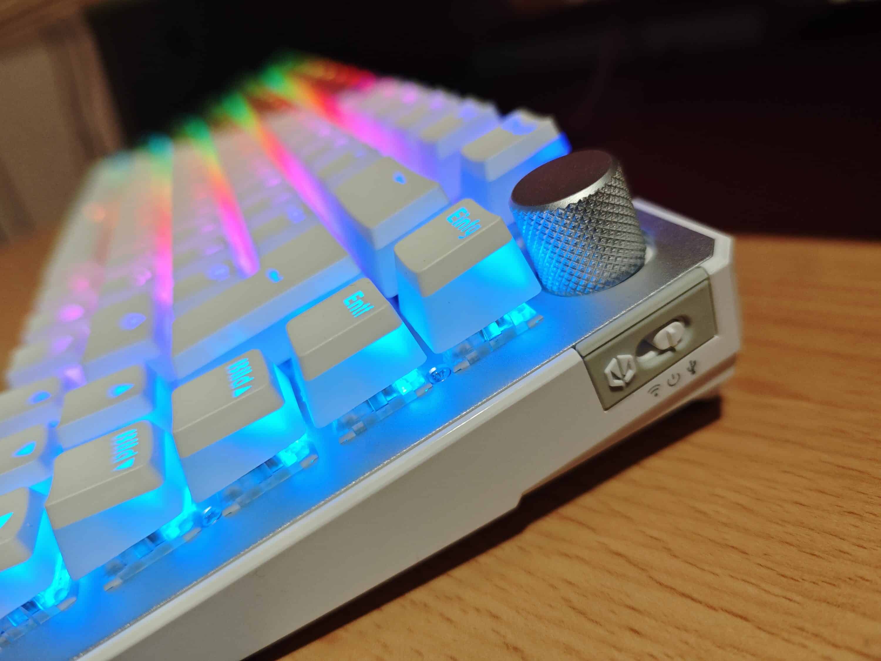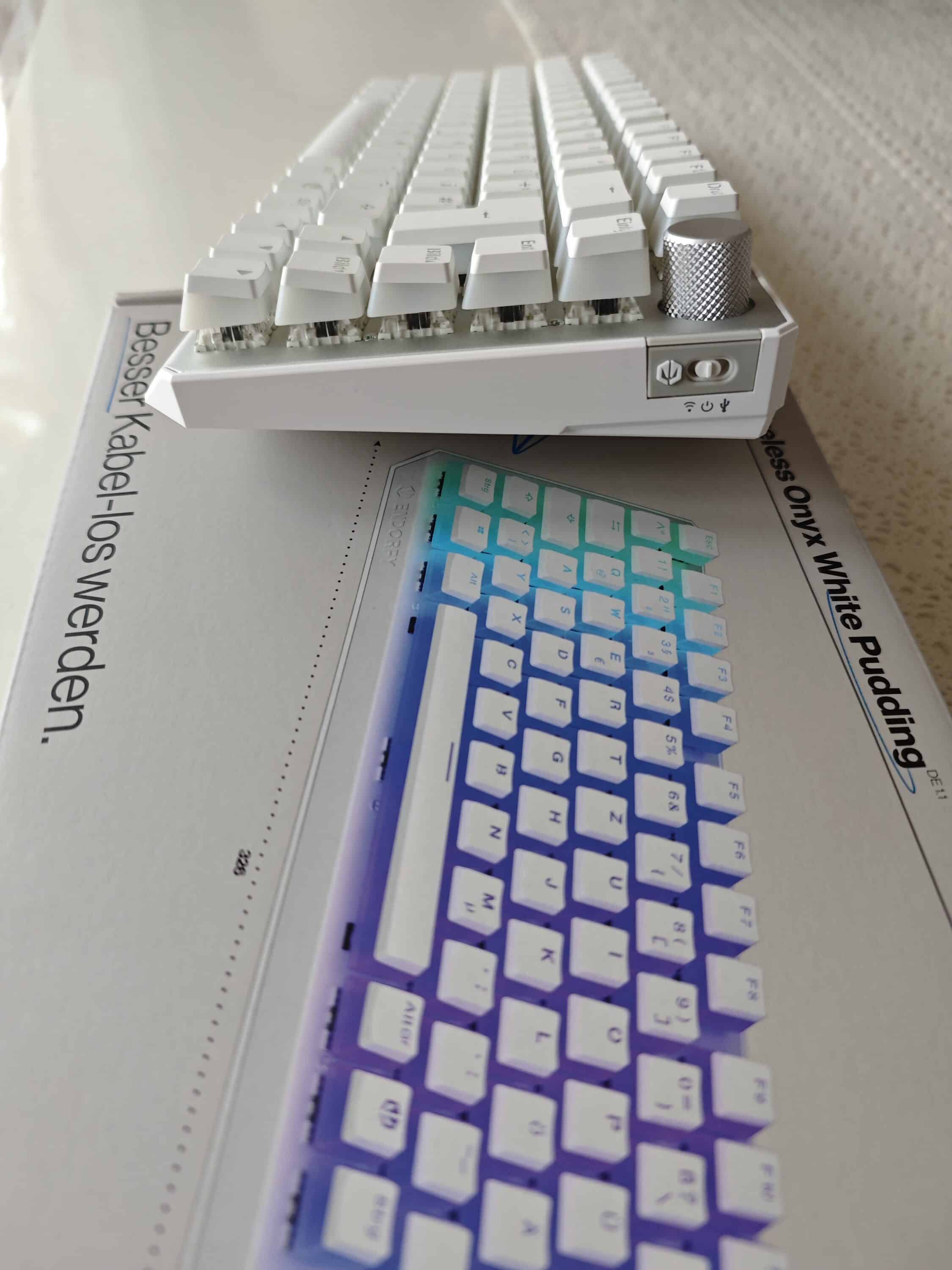 Wenn im Funk-Modus die Endorfy-Spezial-Taste gedrückt und gehalten wird und dann zusätzlich noch die Leertaste drückt, wechselt die Endorfy-Taste ihre Farbe. Je nach Akkustand leuchtet diese dann Weiß (bis 100%), Grün (bis 90%), Gelb (bis 50%) oder Rot (bis 20%). Die Caps der Pudding-Version sind unten rum transparent ausgeführt, daher gibt es hier auch eine seitliche RGB-Ausleuchtung der Tasten.
