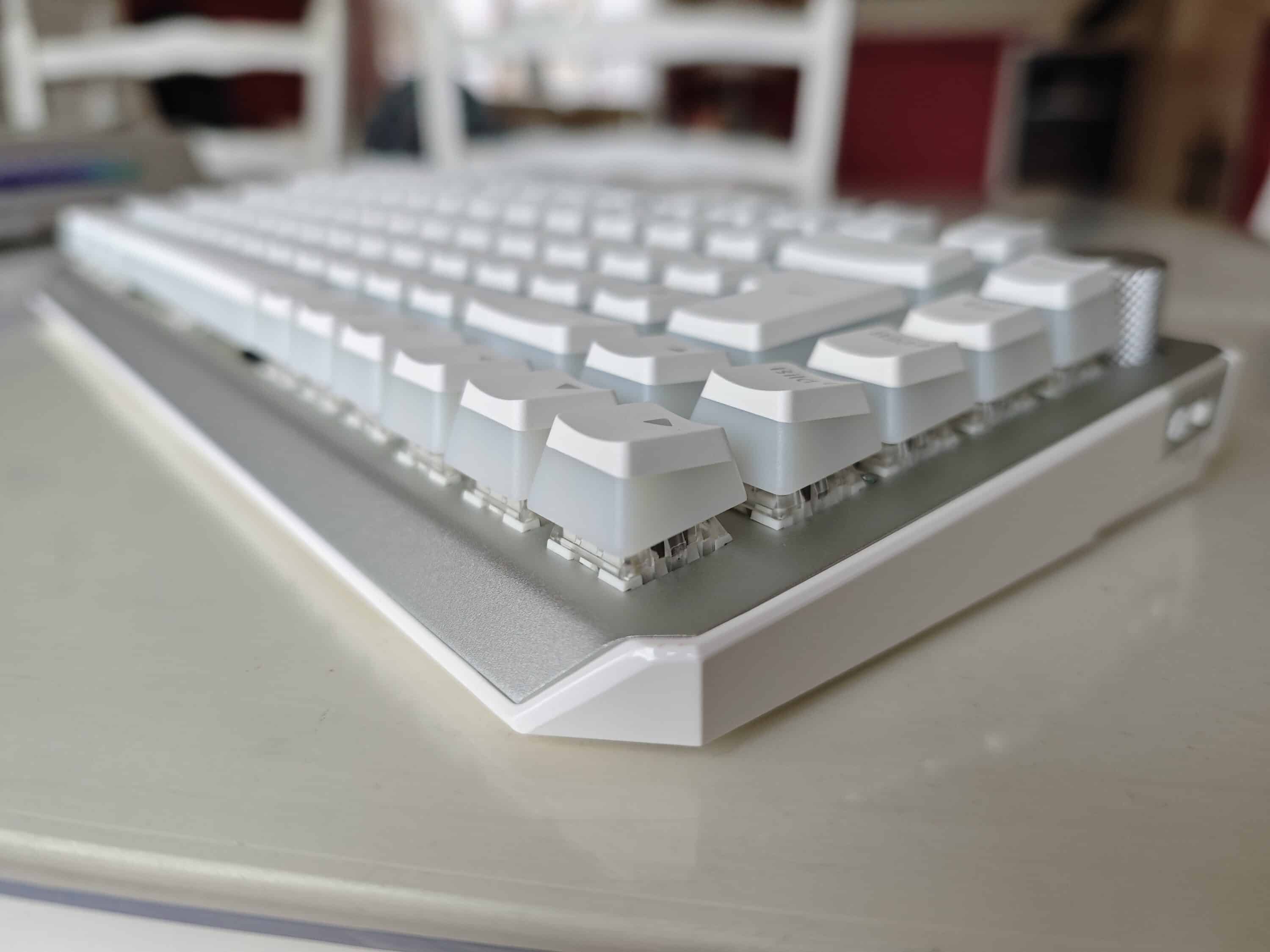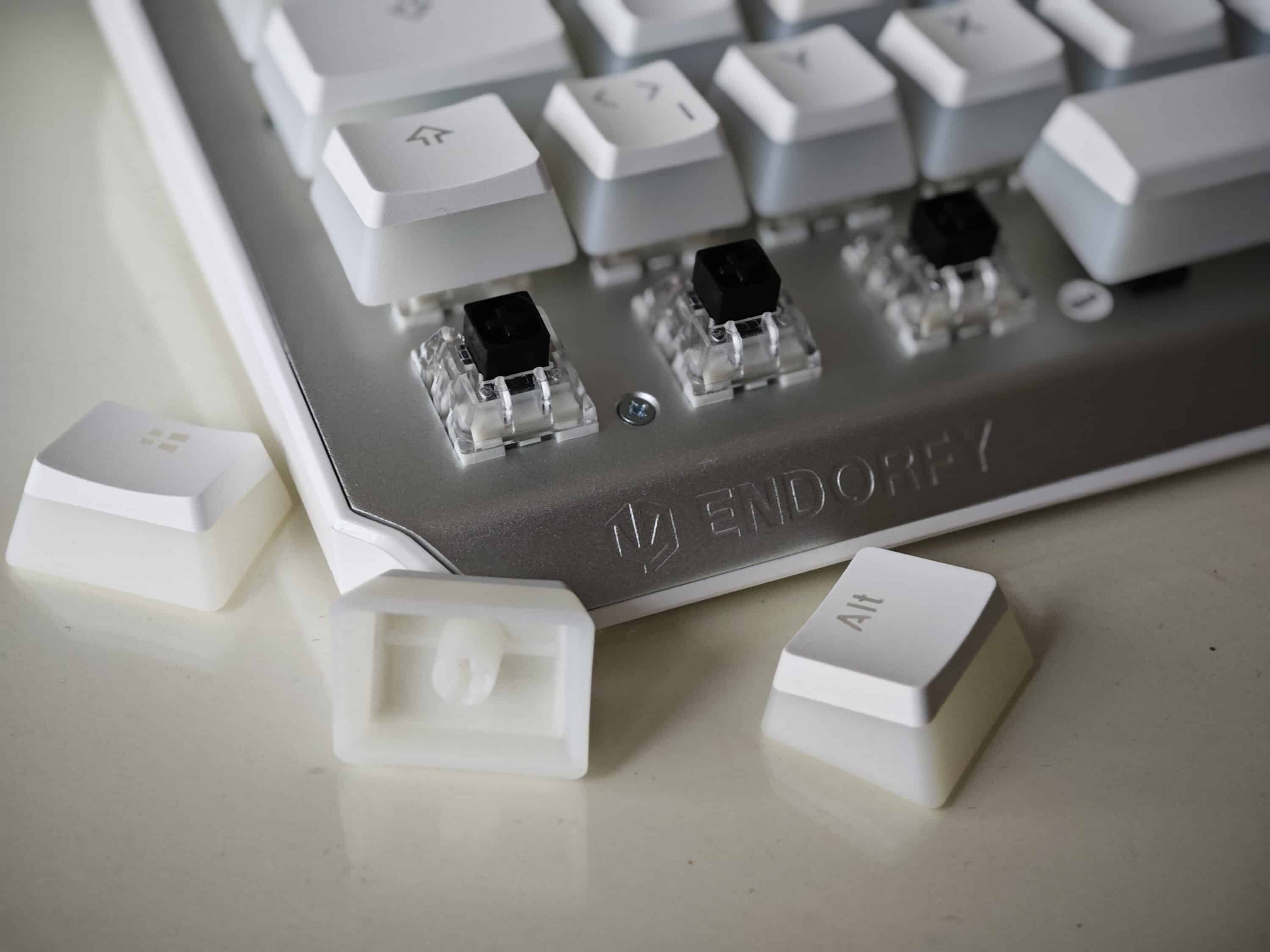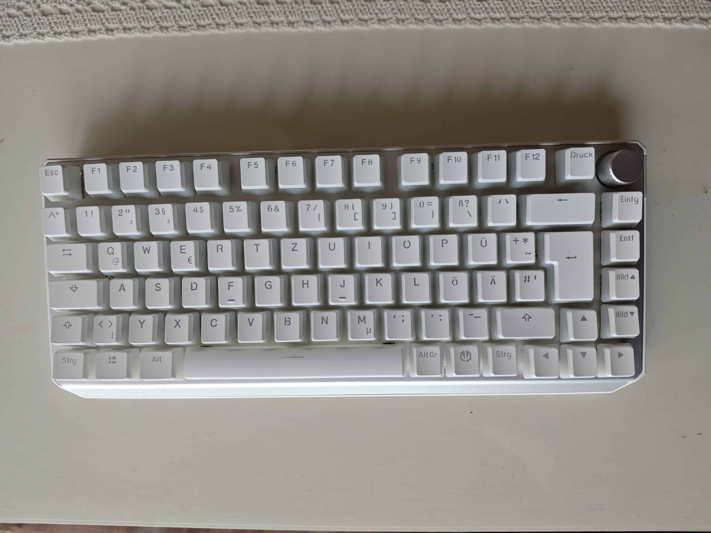 Die Tasten fühlen sich sofort sehr hochwertig an. Das Druckgefühl ist angenehm und man bekommt ein gutes Feedback über die ausgeführte Aktion. Das gefällt hier schon besser als bei der vorliegenden Corsair K65. Im Vergleich fühlen sich die Tasten der Corsair (White Switches) etwas lose an und klappern auch etwas lauter. Dafür ist dort das Feedback klarer und eindeutiger, sozusagen empfindlicher. Die Endorfy Thock ist im Vergleich deutlich leiser, die Tasten etwas geschmeidiger und weicher.
