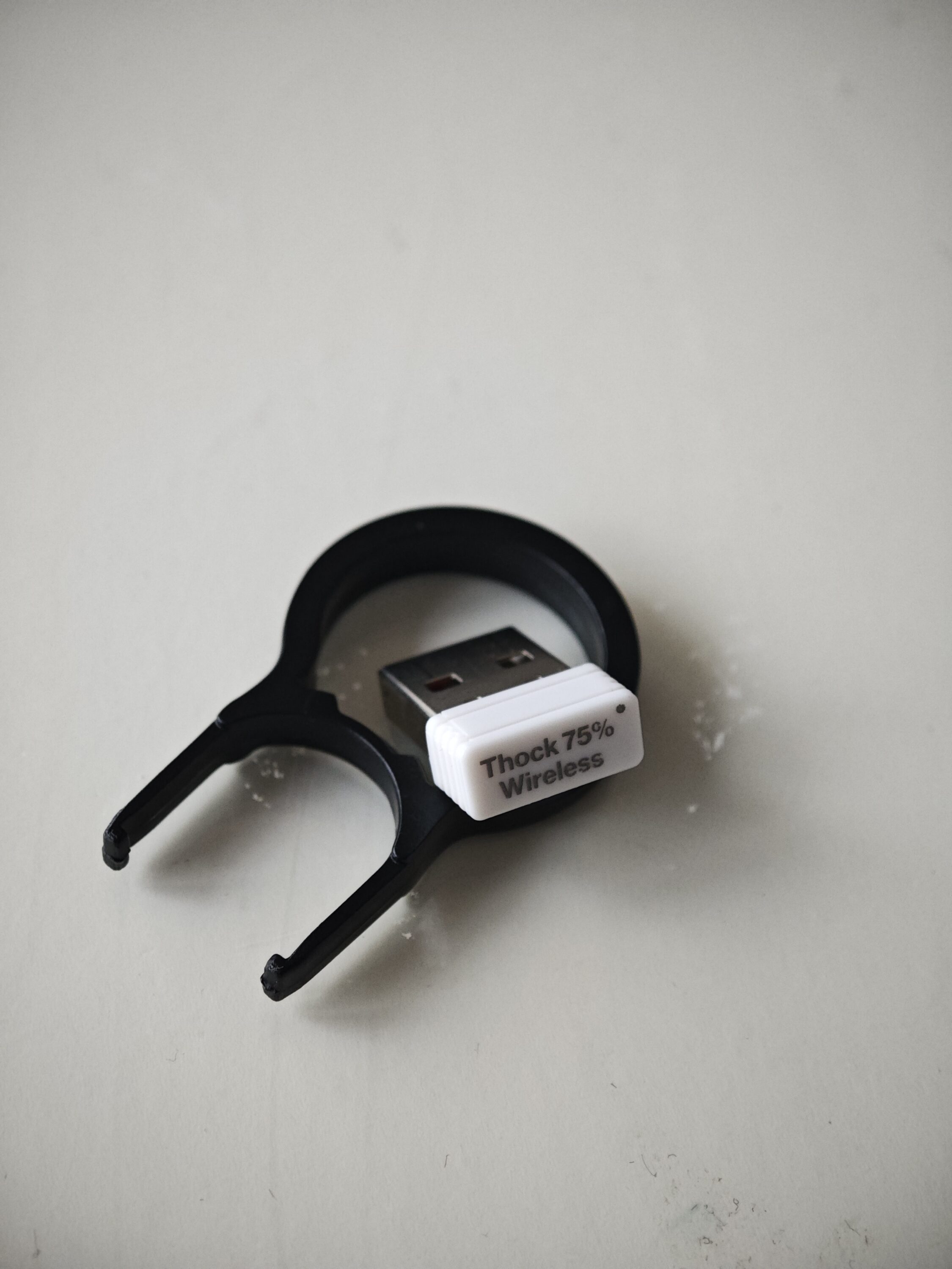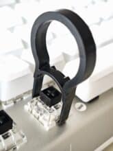 Als weiteres Zubehör wurde noch eine silberne Klammer mit in das Paket gelegt, mit der die weißen Caps sauber gegriffen und abgezogen werden können. Unter der Tastatur ist noch ein schwarzes Tool eingerastet, mit dem die Switches / Druckschalter entfernt und ausgetauscht werden können. Zusätzlich ist dort ebenfalls noch ein USB- Dongle magnetisch arretiert.
