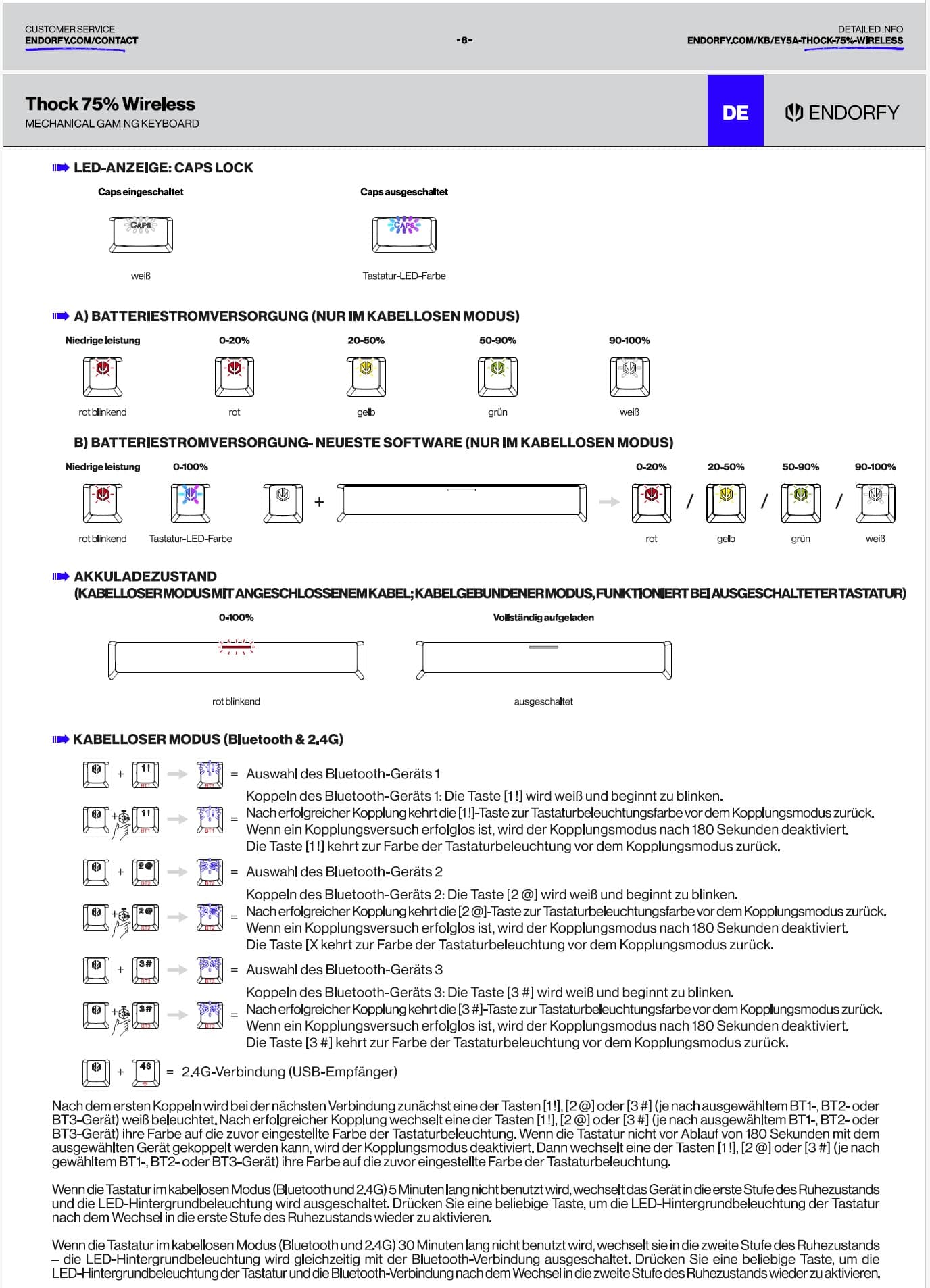 Und wenn wir schon bei der Bedienungsanleitung sind. Diese lässt sich zwar ebenfalls auf der Homepage downloaden, allerdings nicht unter Support. Die dort hinterlegten Links funktionierten in meinem Fall nicht. Man muss sich das gewünschte Produkt Thock 75% Wireless Onyx White selbst unter der Rubrik: Products raussuchen, ganz nach unten scrollen und dort schließlich auch die Bedienungsanleitung als pdf Datei finden. Diese besteht im Endeffekt auch nur aus 2 Seiten, dafür sind ziemlich viele Sprachen vertreten.