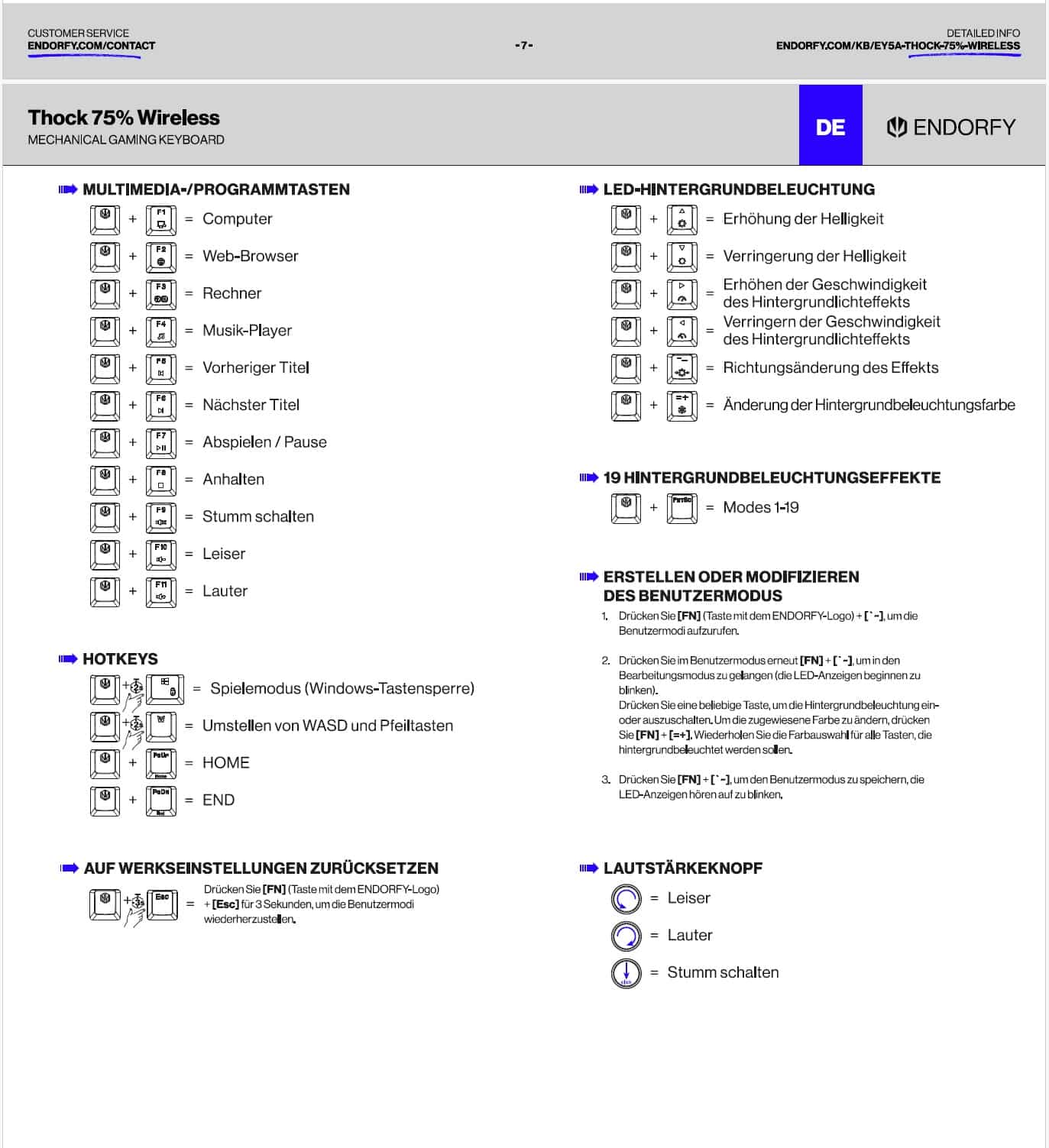 Es lassen sich aber einige Funktionen auch über Tastenkombinationen ausführen, wenn die Endorfy-Taste mit dem Endorfy-Symbol (wie FN-Taste) in Kombination mit einer Funktionstaste gedrückt wird. Leider wurden auf den Caps keine zusätzlichen Symbole hinterlegt. Deshalb ist diese Möglichkeit nicht sofort ersichtlich und es hat auch den Nachteil, dass man sich die Kombinationen entweder merken muss, oder die pdf griffbereit ablegen sollte.