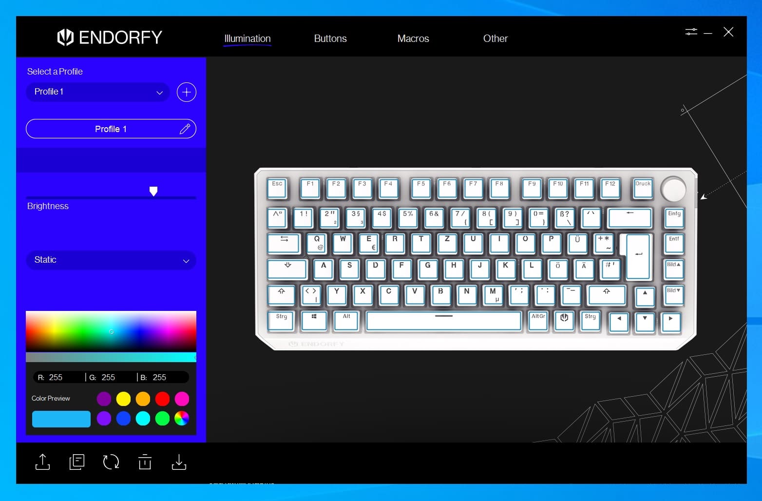 Die Software „Endorfy Wireless Keyboards“ ist sehr übersichtlich gestaltet. Zur Sprachauswahl steht nur Englisch zur Verfügung, was normalerweise kein Problem darstellen sollte. Es gibt hier verschiedene RGB-Muster & Farbverläufe zur Vorauswahl.
