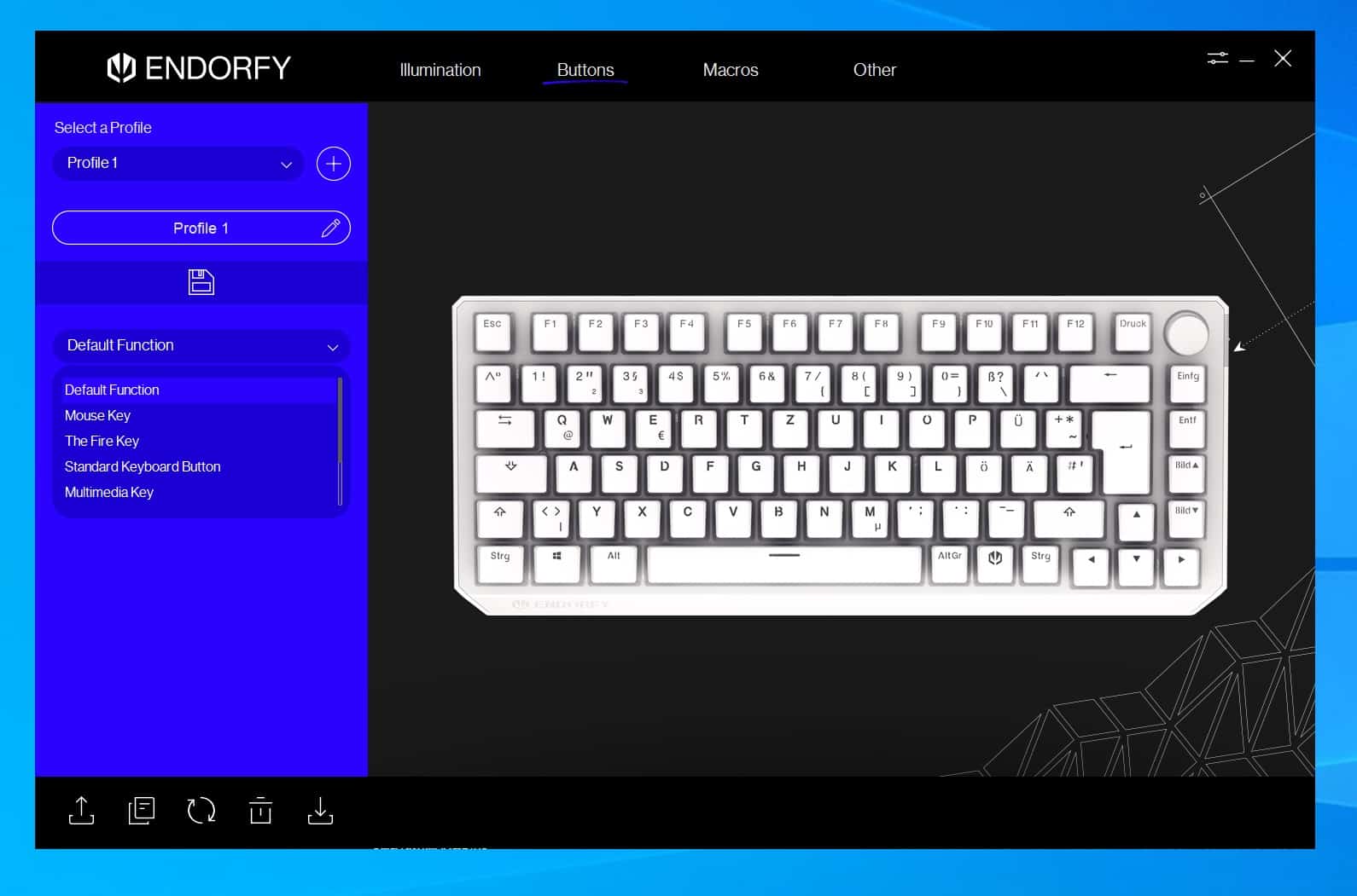 Nach dem Anschluss der Tastatur wurde sogleich die Software installiert. Diese ließ sich bei Endorfy auf der Homepage downloaden. Unter Support wird eine Datei speziell für Wireless Keyboards angeboten.