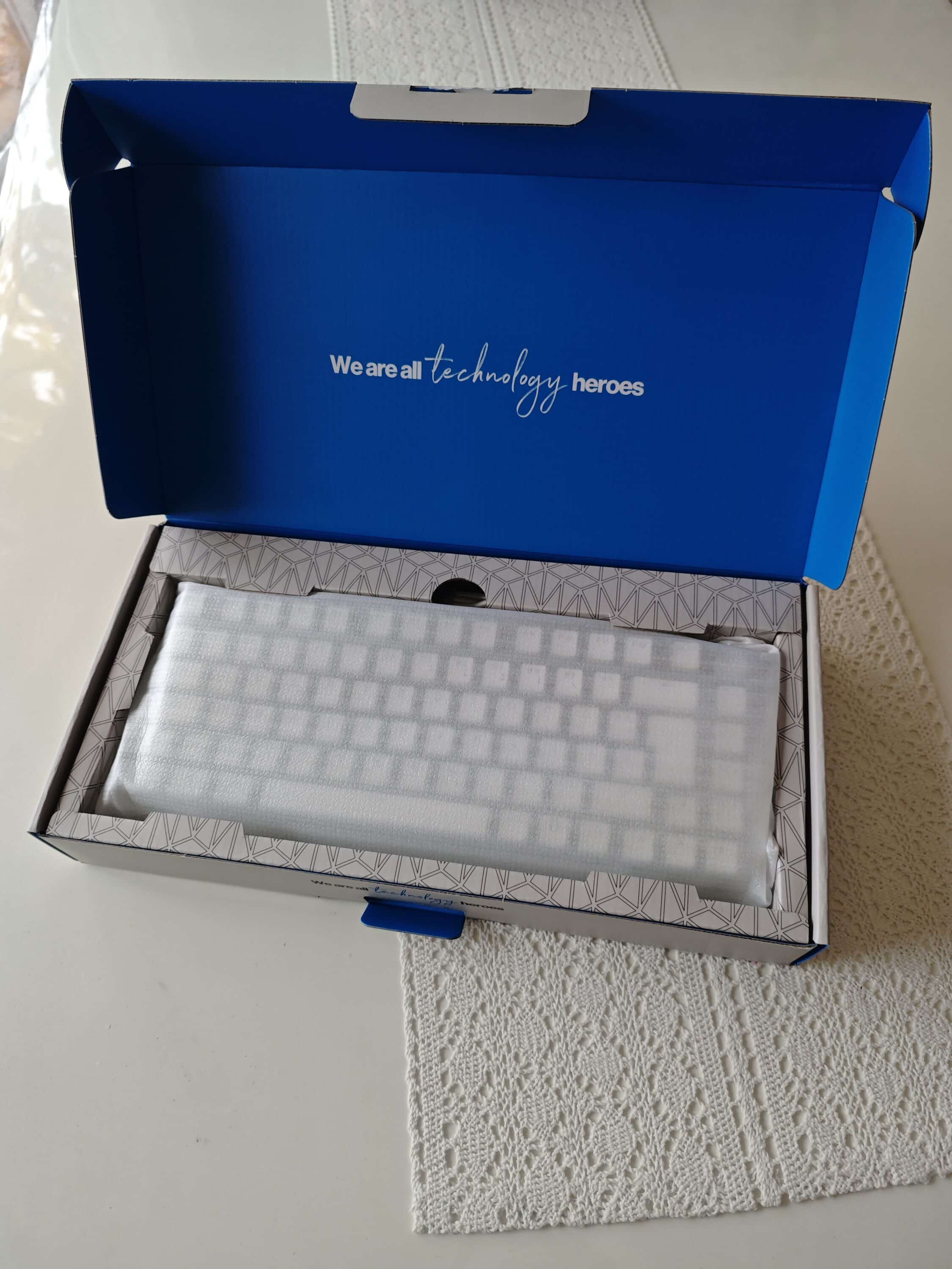 Aber der Versender wollte scheinbar auf Nummer sicher gehen und füllte ihn mit viel Luftpolsterfolie aus. Also die Thock war auf jeden Fall zu 100% „schockfrei“ unterwegs. Hat man die Tastatur dann mal im Polster-Dschungel gefunden, kommt eine schöne helle Verpackung ans Tageslicht.